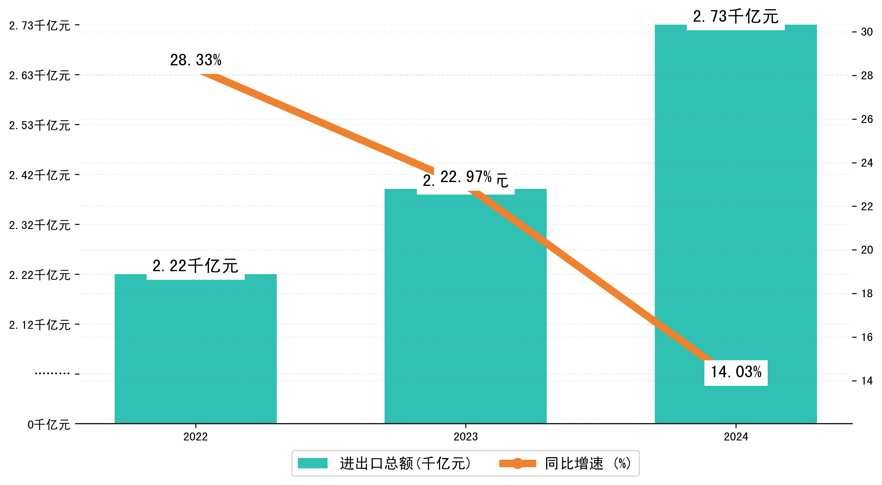 以人民币计,2024年1-12月崇左市进出口总额为2729,6125.6821万元,相比上年同期增加了335,9363.461万元,同比增加了14.00%。