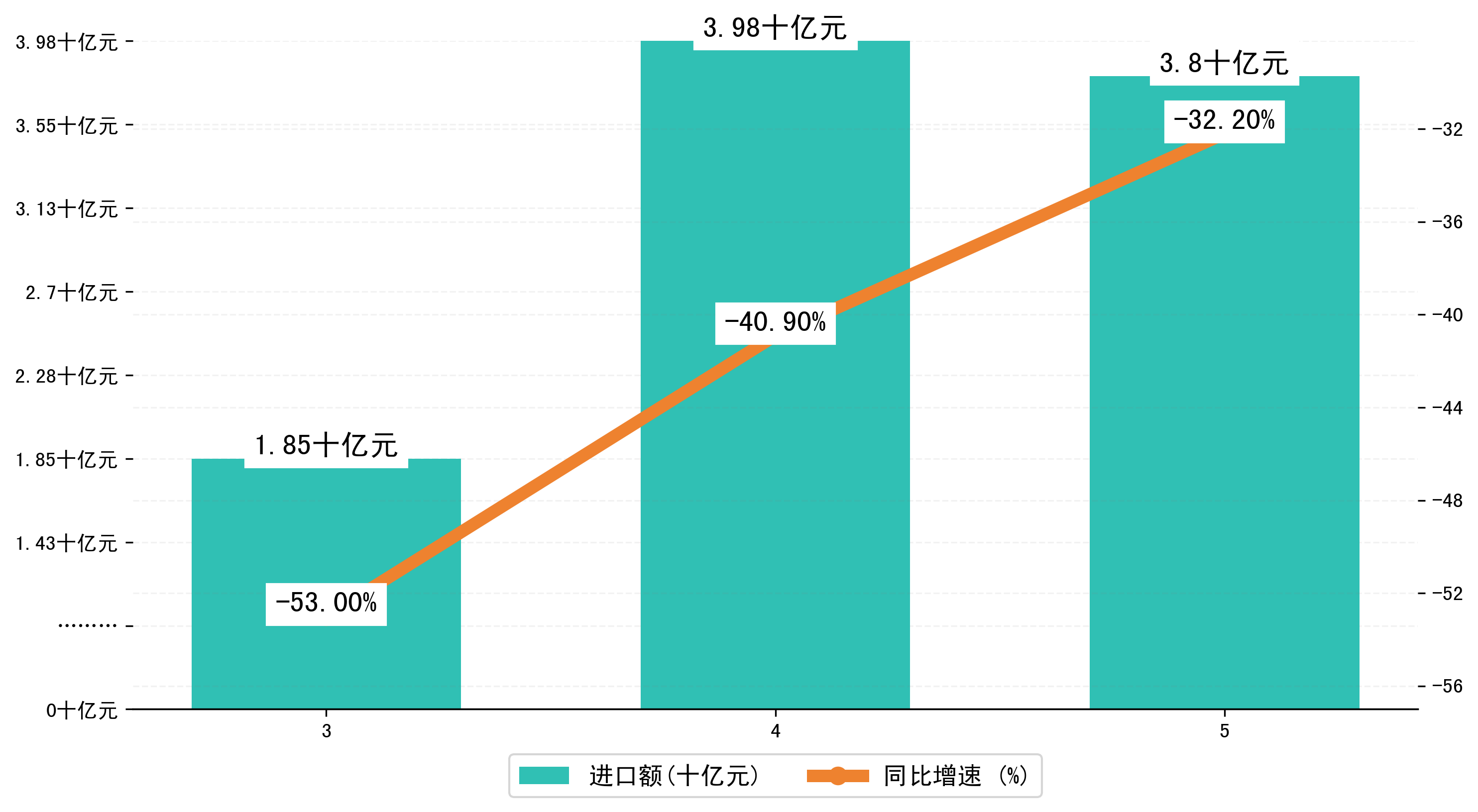 以美元计,2025年5月崇左市进口额为5,2680.2805万美元,相比上月减少了2796.4694万美元;相比上年同期增加了808.6059万美元,同比减少-33.00%。