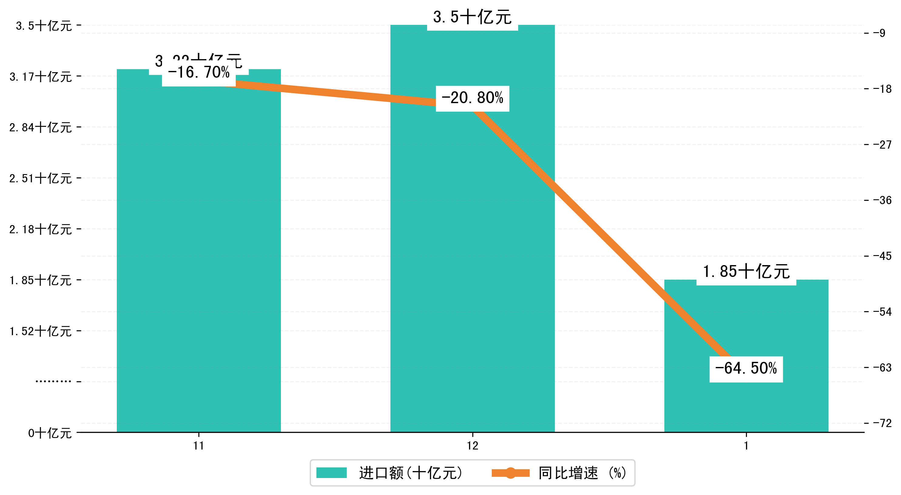 以人民币计,2025年1月崇左市进口额为18,4973.2115万元,相比上月减少了16,5423.0389万元;相比上年同期减少了35,3479.4579万元,同比减少了-64.50%。