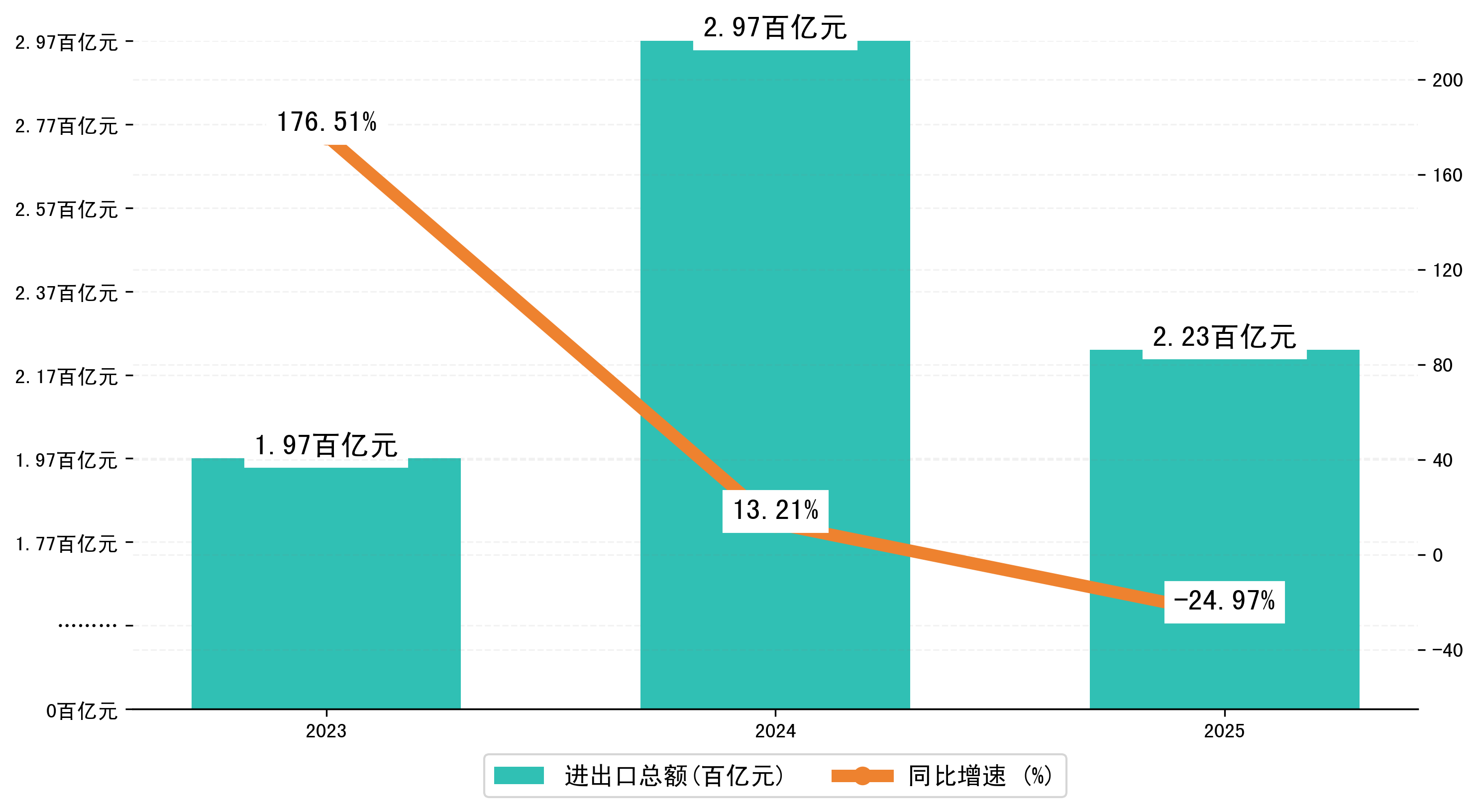 以人民币计,2025年1-1月崇左市进出口总额为222,5794.4659万元,相比上年同期减少了74,0731.0544万元,同比减少了-18.50%。