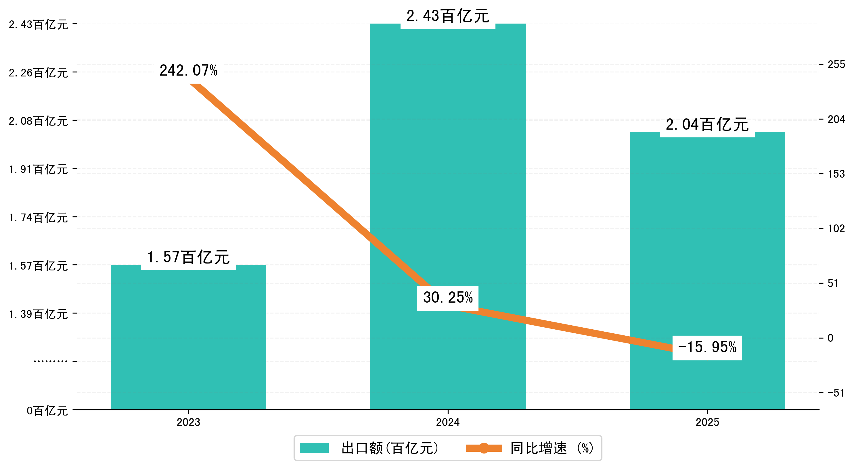 以人民币计,2025年1-1月崇左市出口额为204,0821.2544万元,相比上年同期减少了38,7251.5965万元,同比减少了-7.70%。