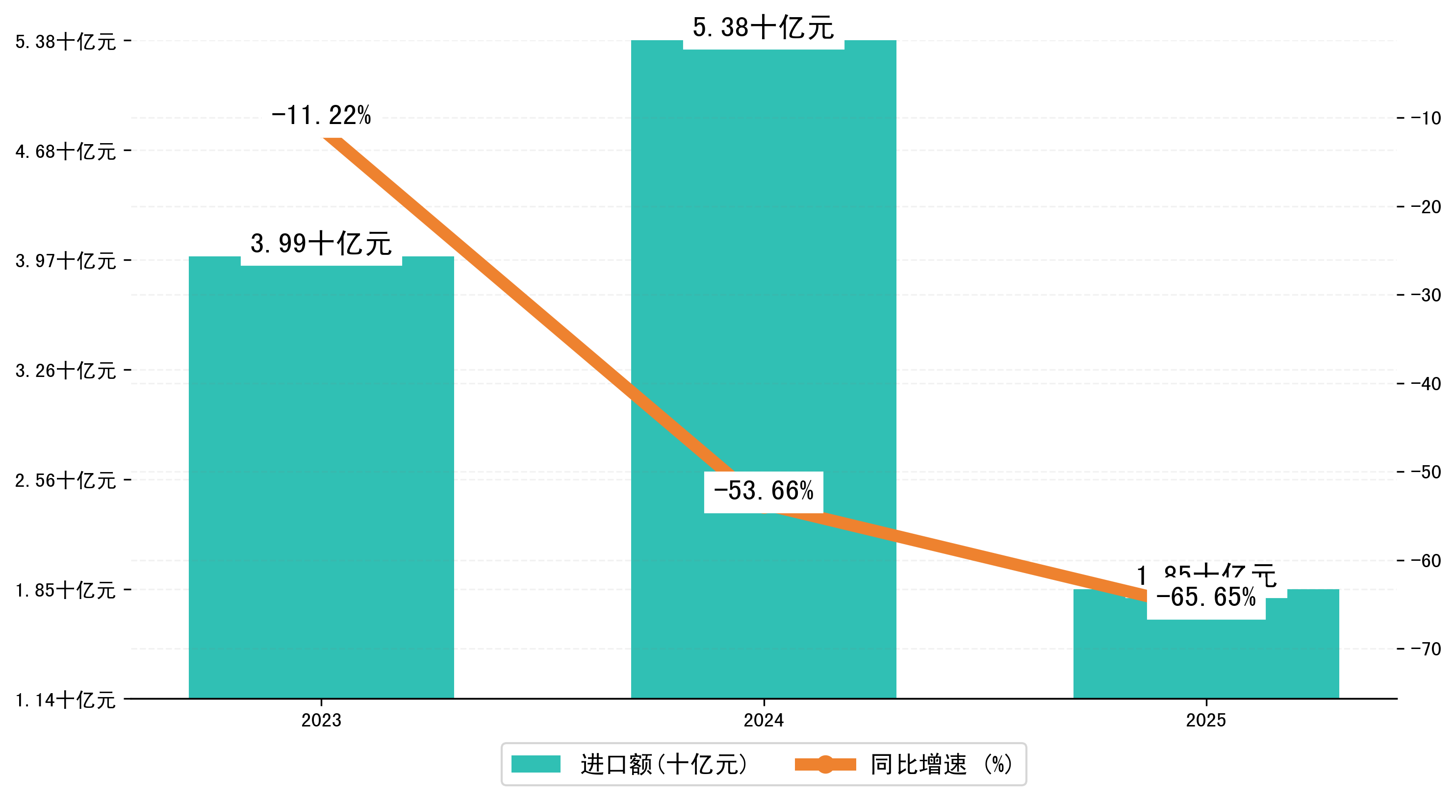 以美元计,2025年1-1月崇左市进口额为2,5733.5469万美元,相比上年同期减少了5,0046.4089万美元,同比减少-64.90%。
