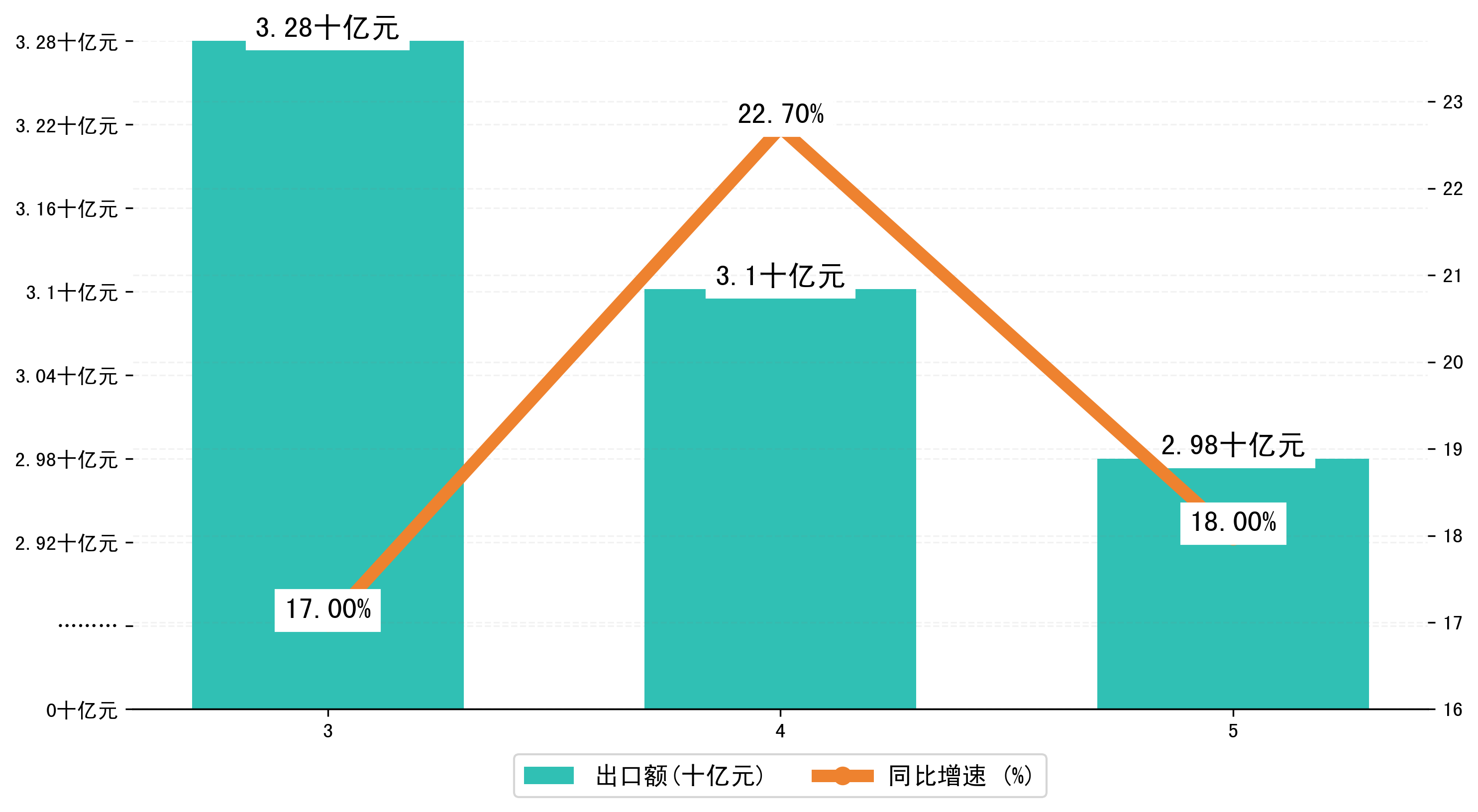 以人民币计,2023年5月滁州市贸易差额为22,9099,5149万元(贸易顺差),相比上月减少了2,9975,5662万元,即4479,4231万美元;相比上年同期减少了2063,0908万元,同比减少-0.89%。