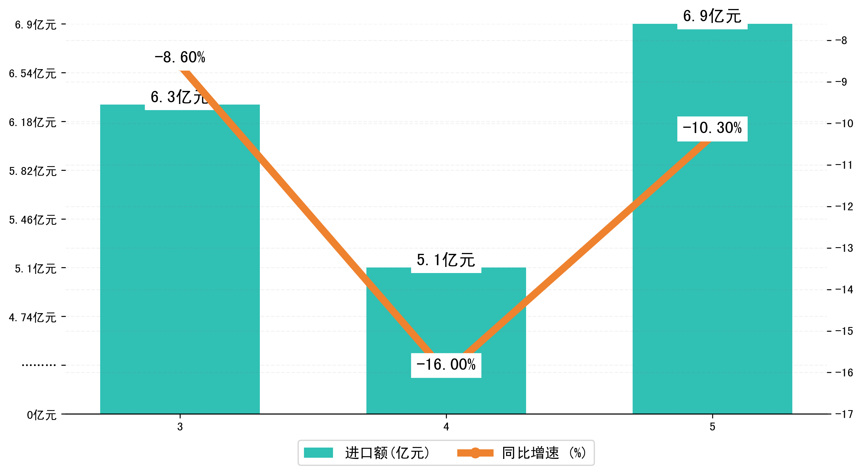 以人民币计,2023年1-5月滁州市进口额为27,5232.8888万元,相比上年同期减少了3,1603.8364万元,同比减少了-10.30%。