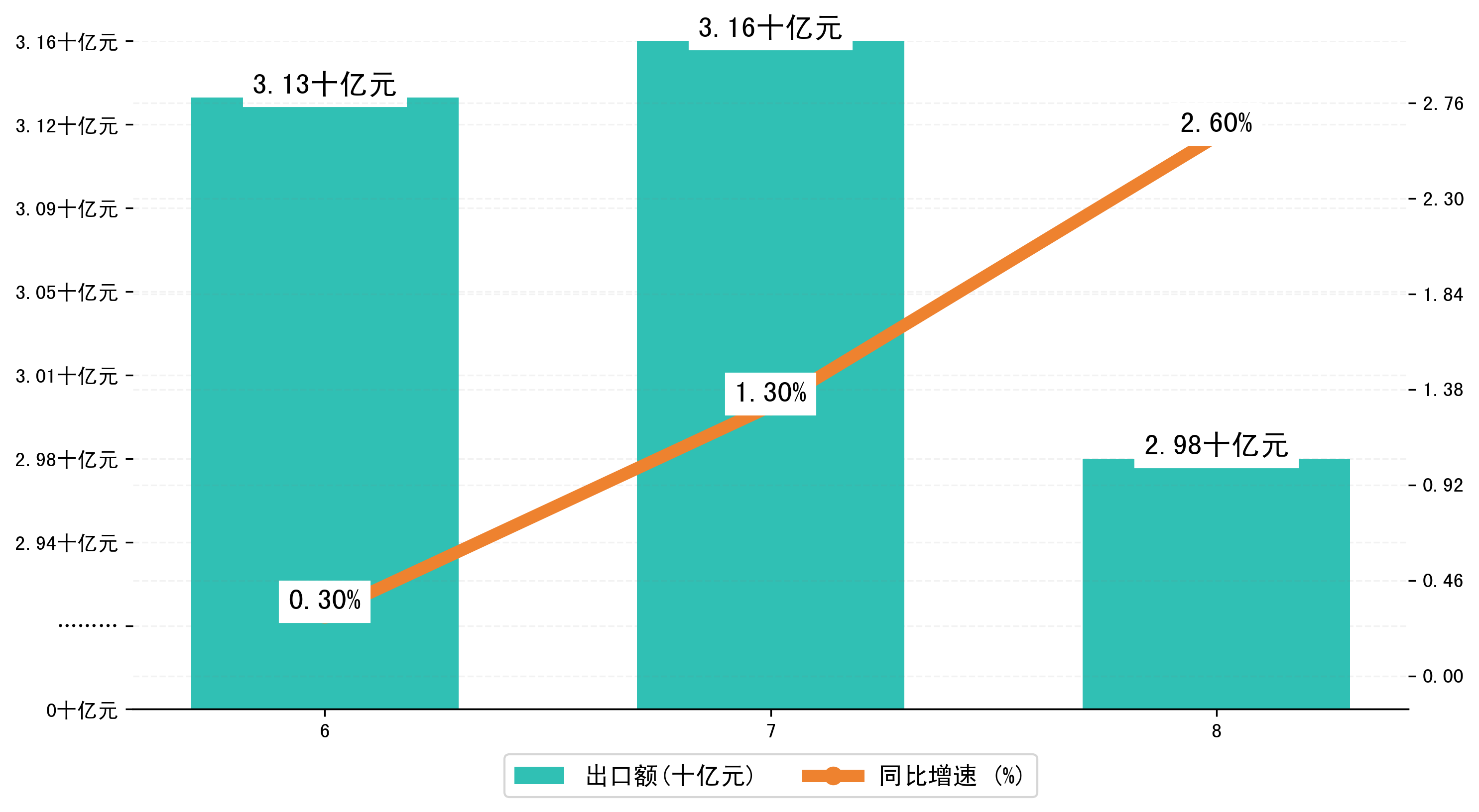 以美元计,2024年1-8月滁州市出口额为32,9893.9398万美元,相比上年同期减少了8816.8765万美元,同比增加0.30%。