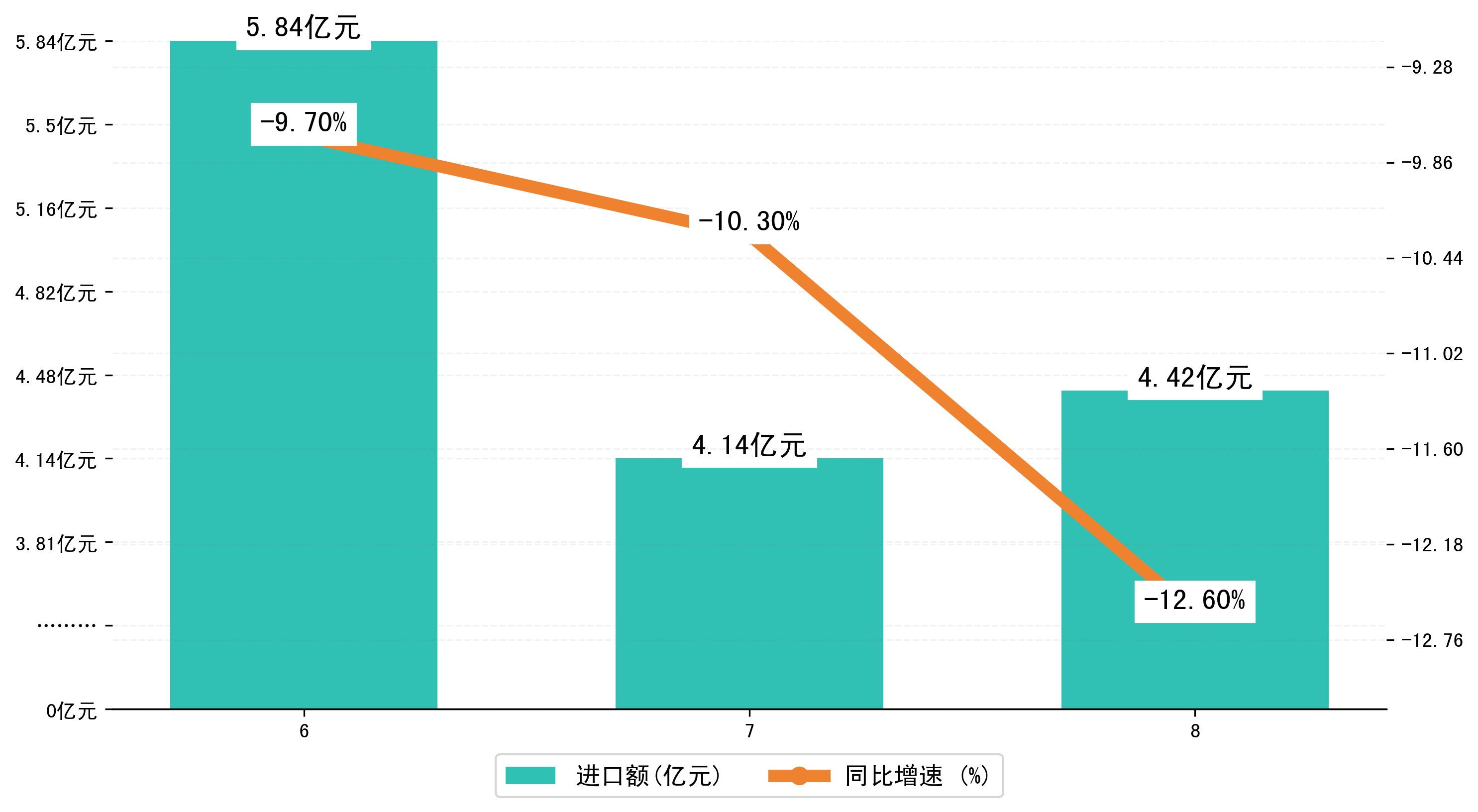 以人民币计,2024年1-8月滁州市进口额为37,8629.6133万元,相比上年同期减少了5,4826.0304万元,同比减少了-12.60%。