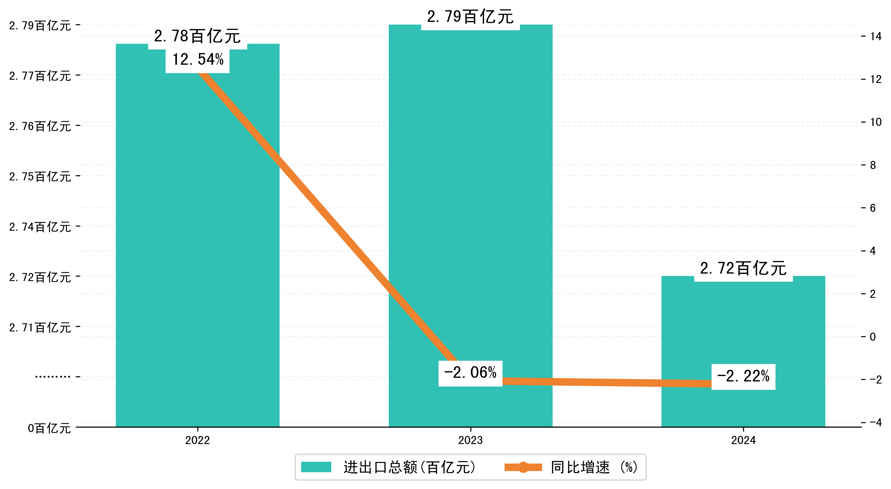 以人民币计,2024年1-8月滁州市进出口总额为272,4009.3841万元,相比上年同期减少了6,1934.7355万元,同比增加了0.20%。
