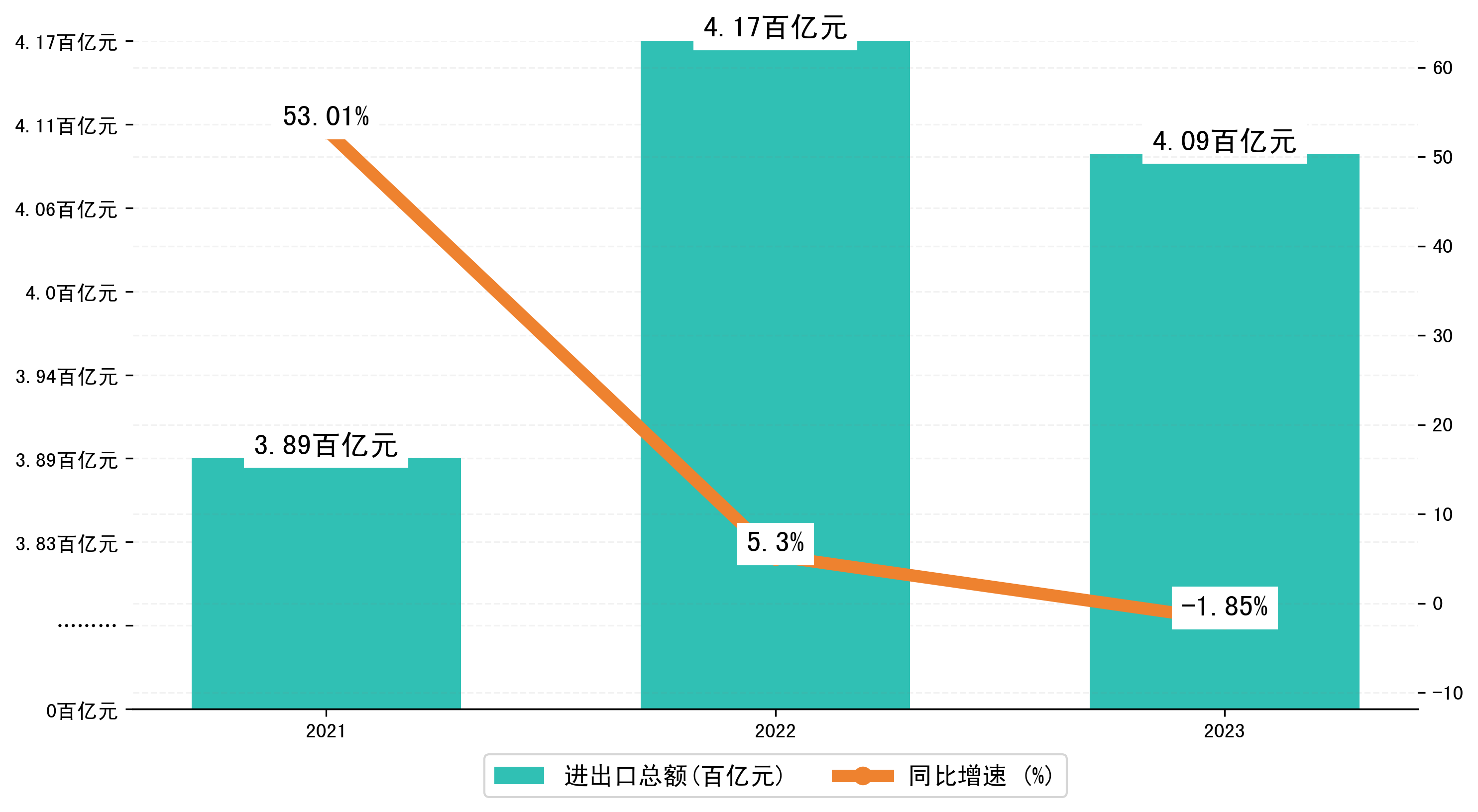 以人民币计,2023年1-12月滁州市进出口总额为409,3935.4235万元,相比上年同期减少了7,7171.1842万元,同比增加了5.10%。