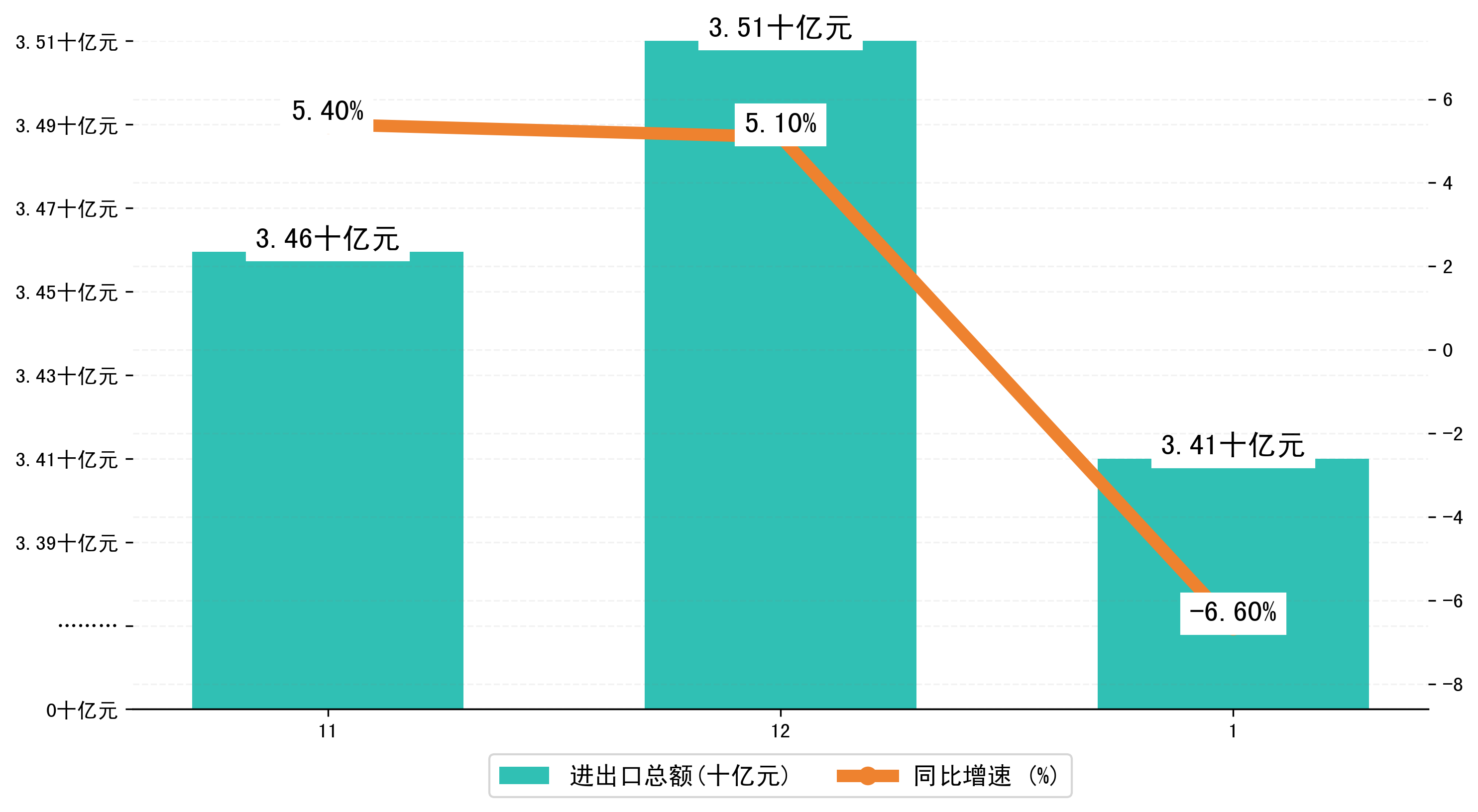 以人民币计,2024年1-1月滁州市进出口总额为34,0668.5574万元,相比上年同期减少了3,8719.7375万元,同比减少了-6.60%。