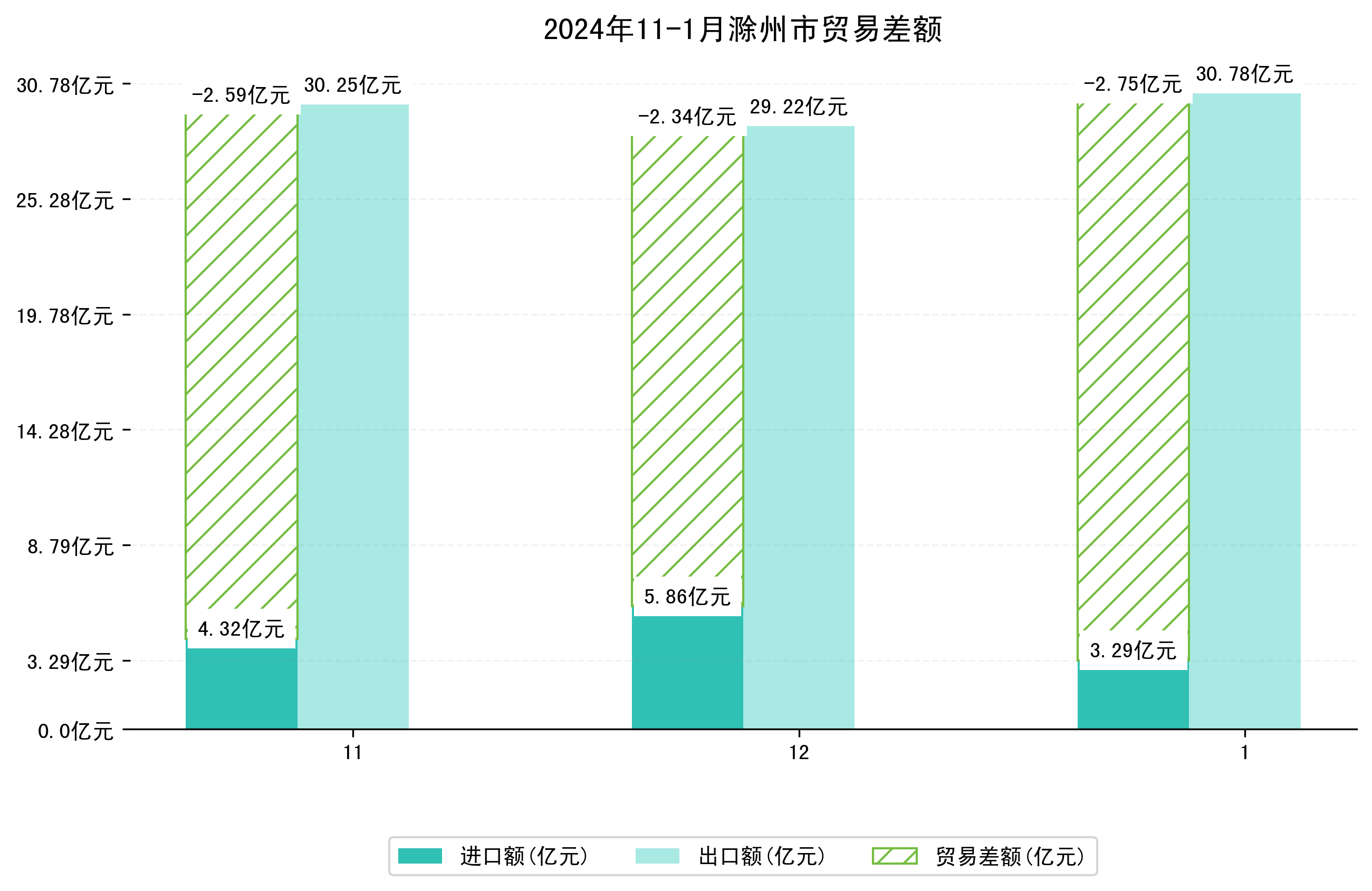以人民币计,2024年1-1月滁州市贸易差额为27,4859,7156万元(贸易顺差),相比上年同期减少了7961,4392万元,同比减少-2.82%。
