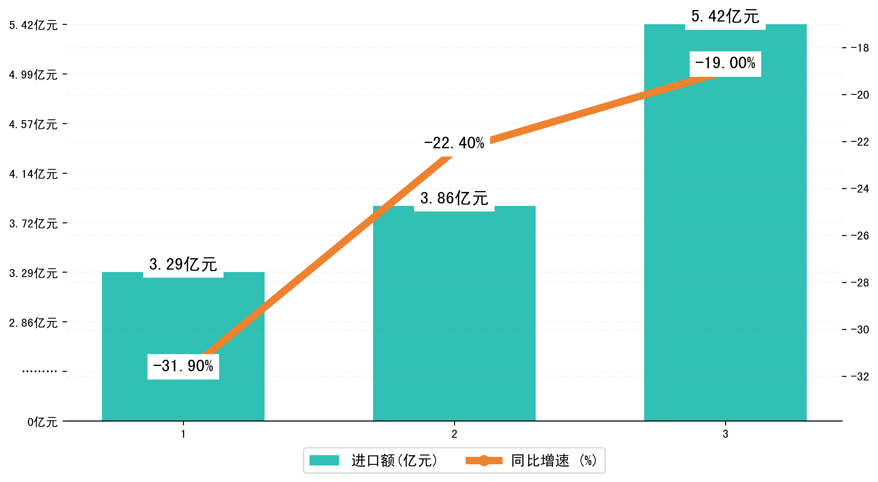 以人民币计,2024年1-3月滁州市进口额为12,5701.2675万元,相比上年同期减少了2,9490.9286万元,同比减少了-19.00%。