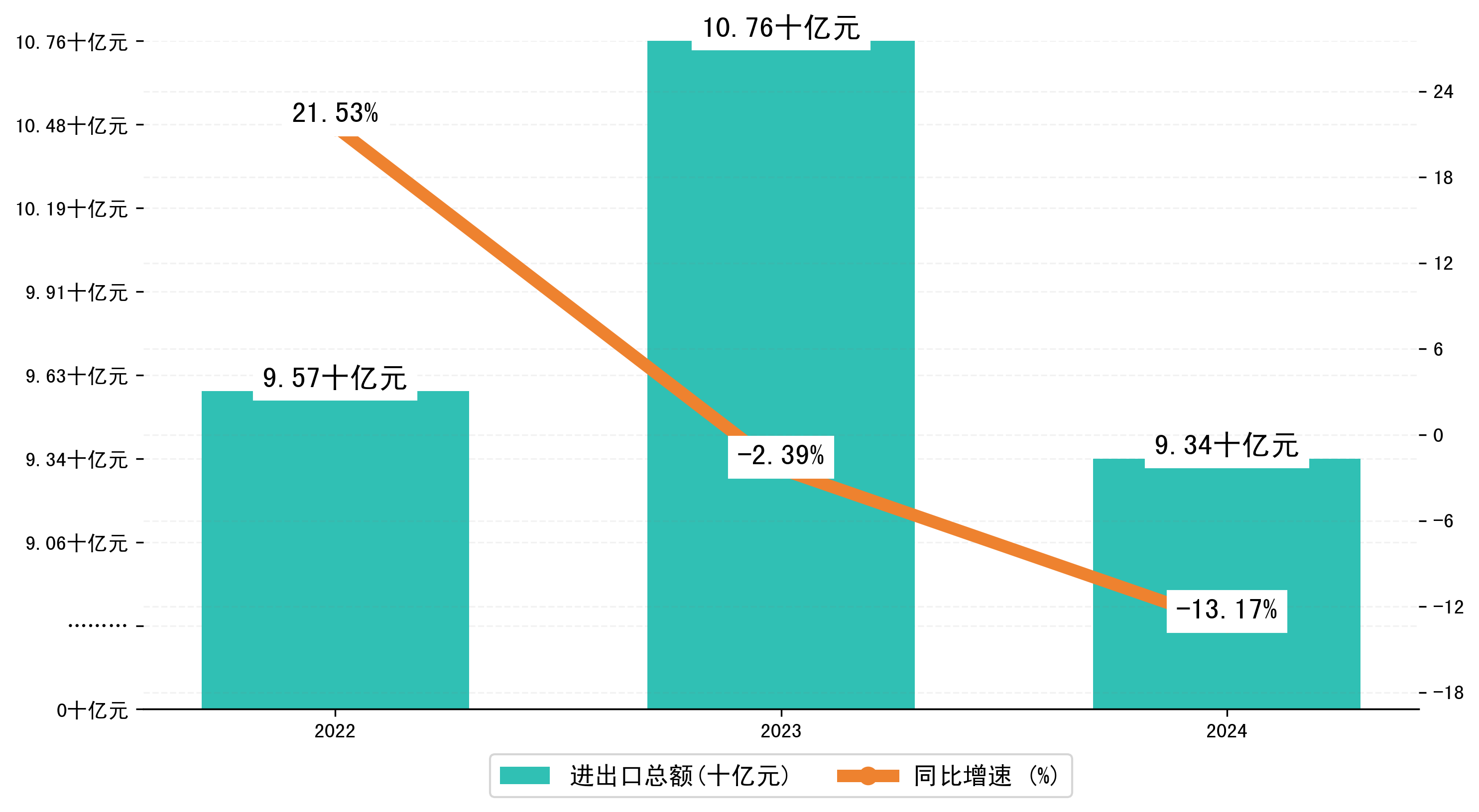 以人民币计,2024年1-3月滁州市进出口总额为93,4424.0738万元,相比上年同期减少了14,1764.8409万元,同比减少了-9.00%。