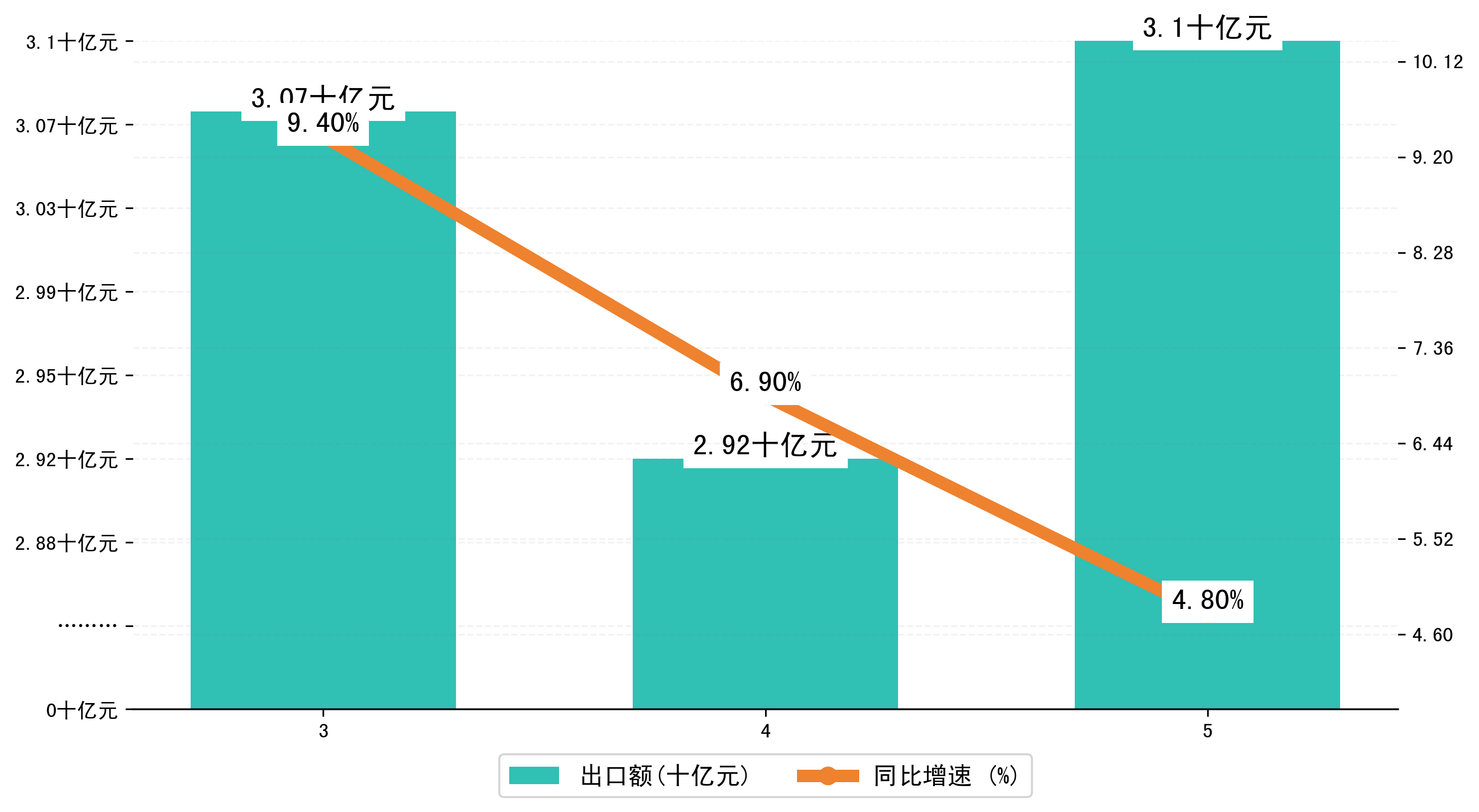 以美元计,2025年5月滁州市贸易差额为3,7037,4858万美元(贸易顺差),相比上月增加了1955,2499万美元;相比上年同期增加了125,0305万美元,同比增加-0.34%。