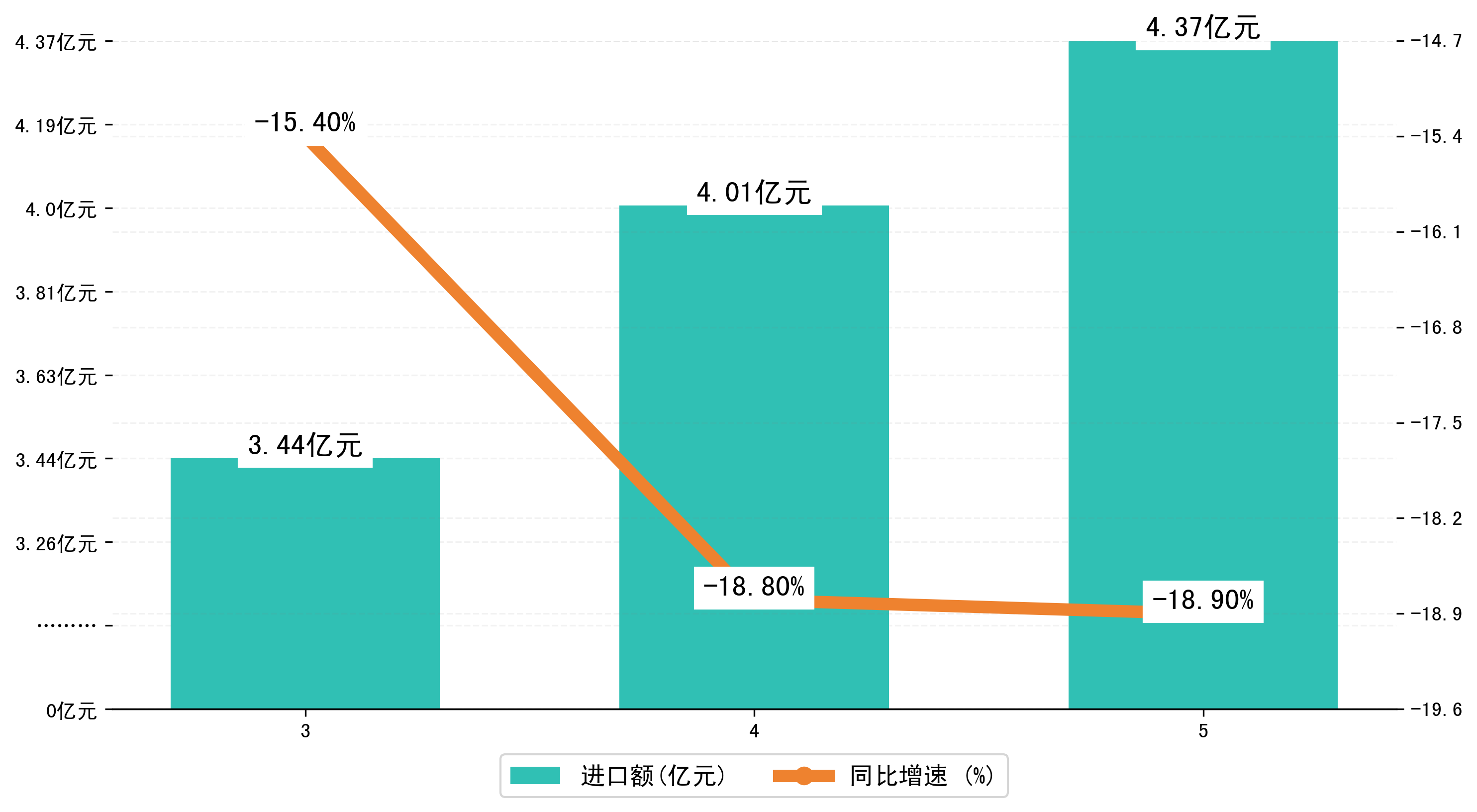 以人民币计,2025年1-5月滁州市进口额为19,0171.2189万元,相比上年同期减少了4,4429.5023万元,同比减少了-18.90%。