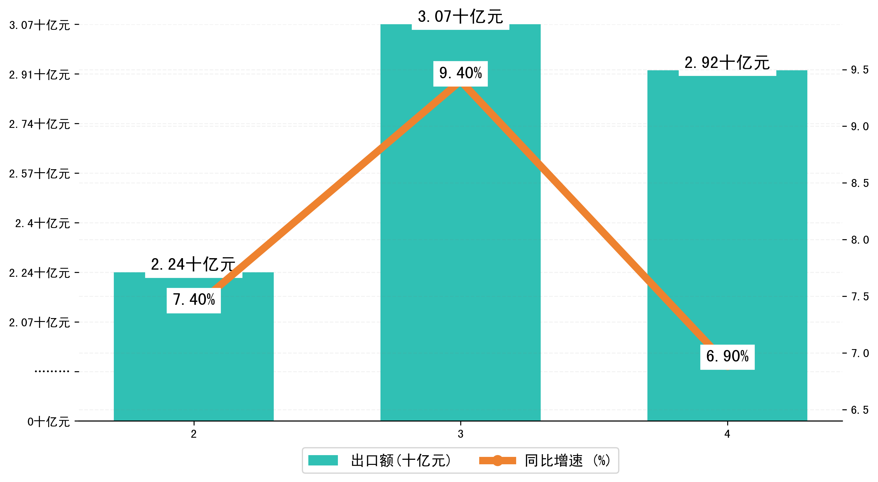 以人民币计,2025年1-4月滁州市贸易差额为102,9082,3692万元(贸易顺差),相比上年同期增加了10,8812,1218万元,同比增加11.82%。