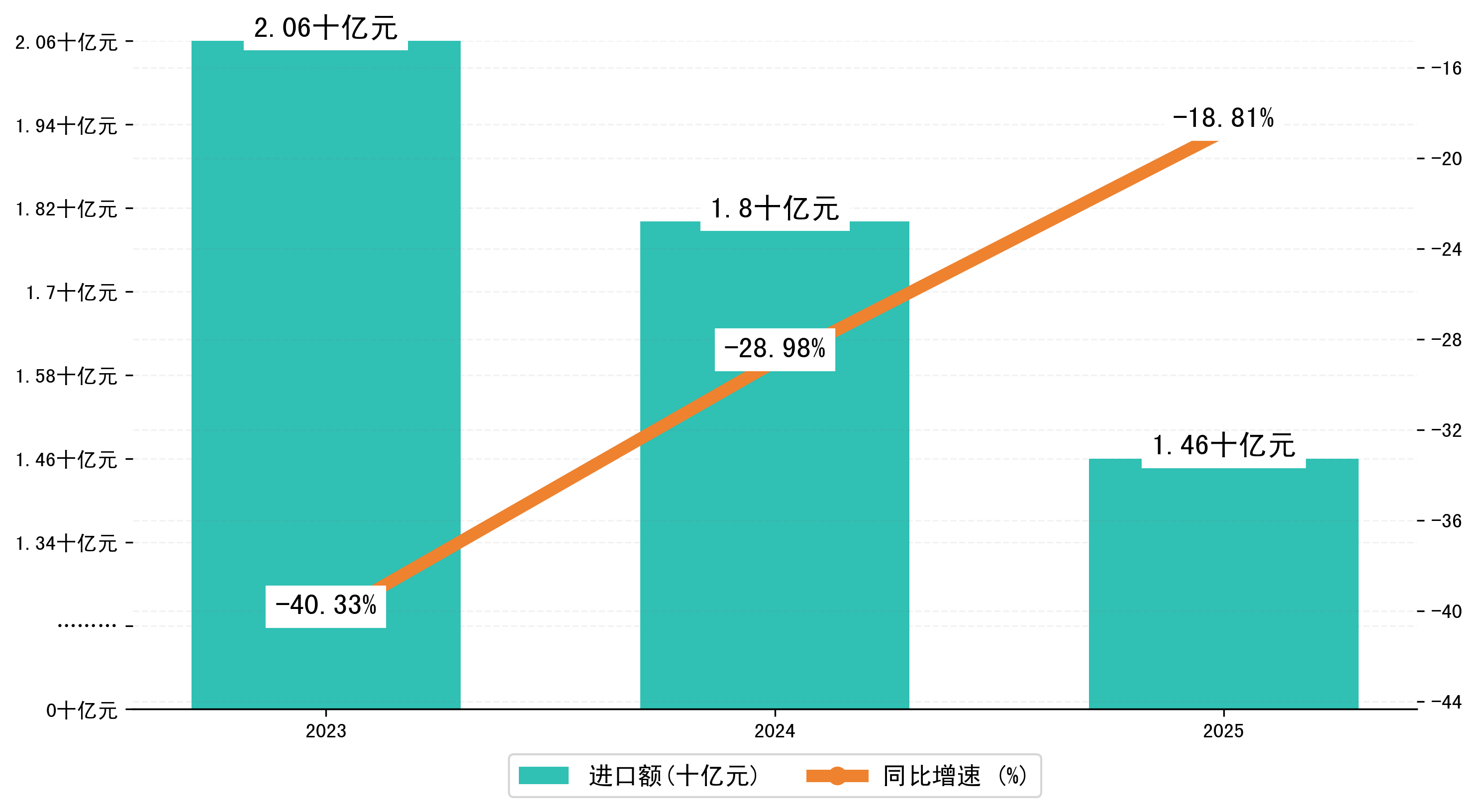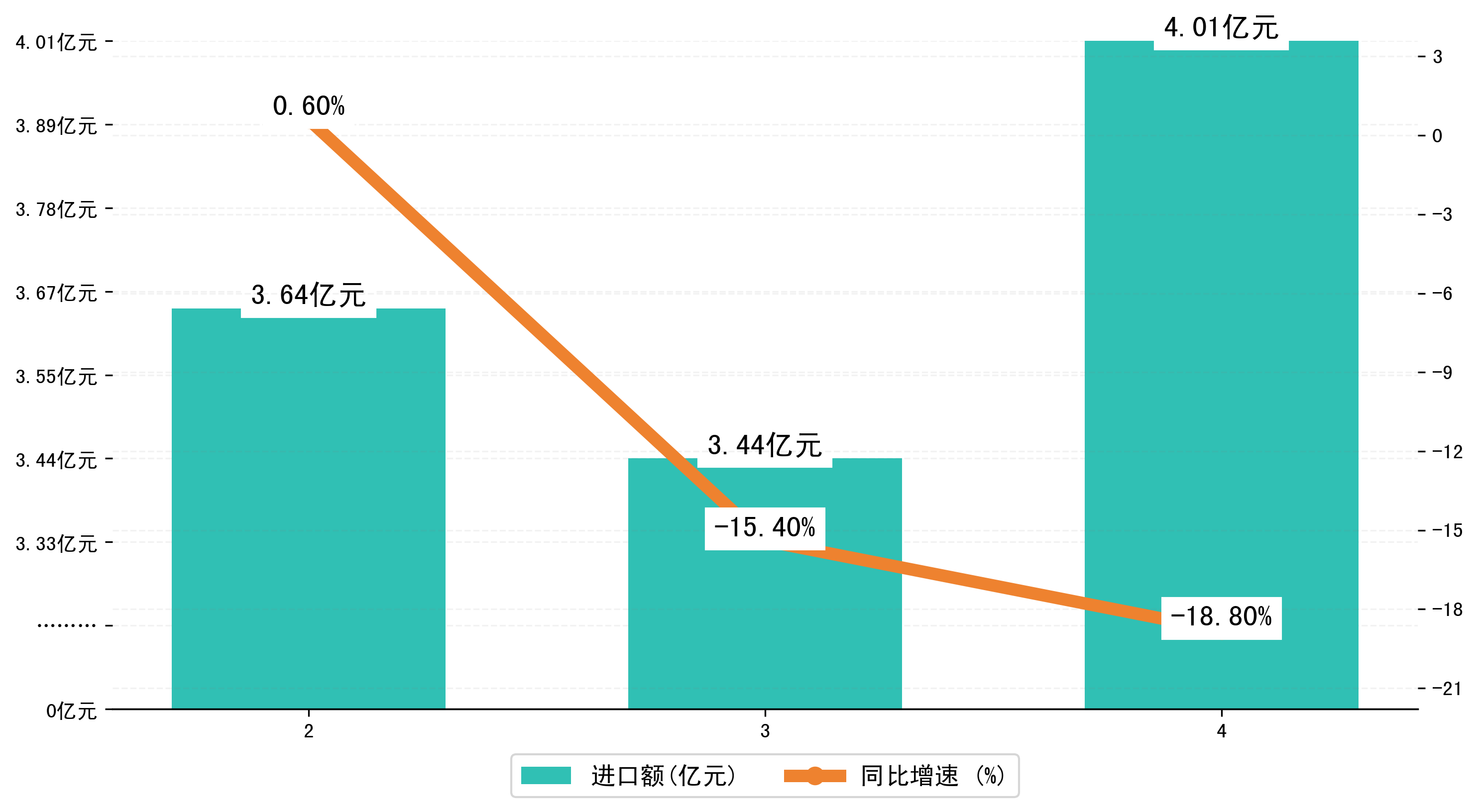以美元计,2025年1-4月滁州市进口额为2,0393.226万美元,相比上年同期减少了4987.3624万美元,同比减少-19.70%。
