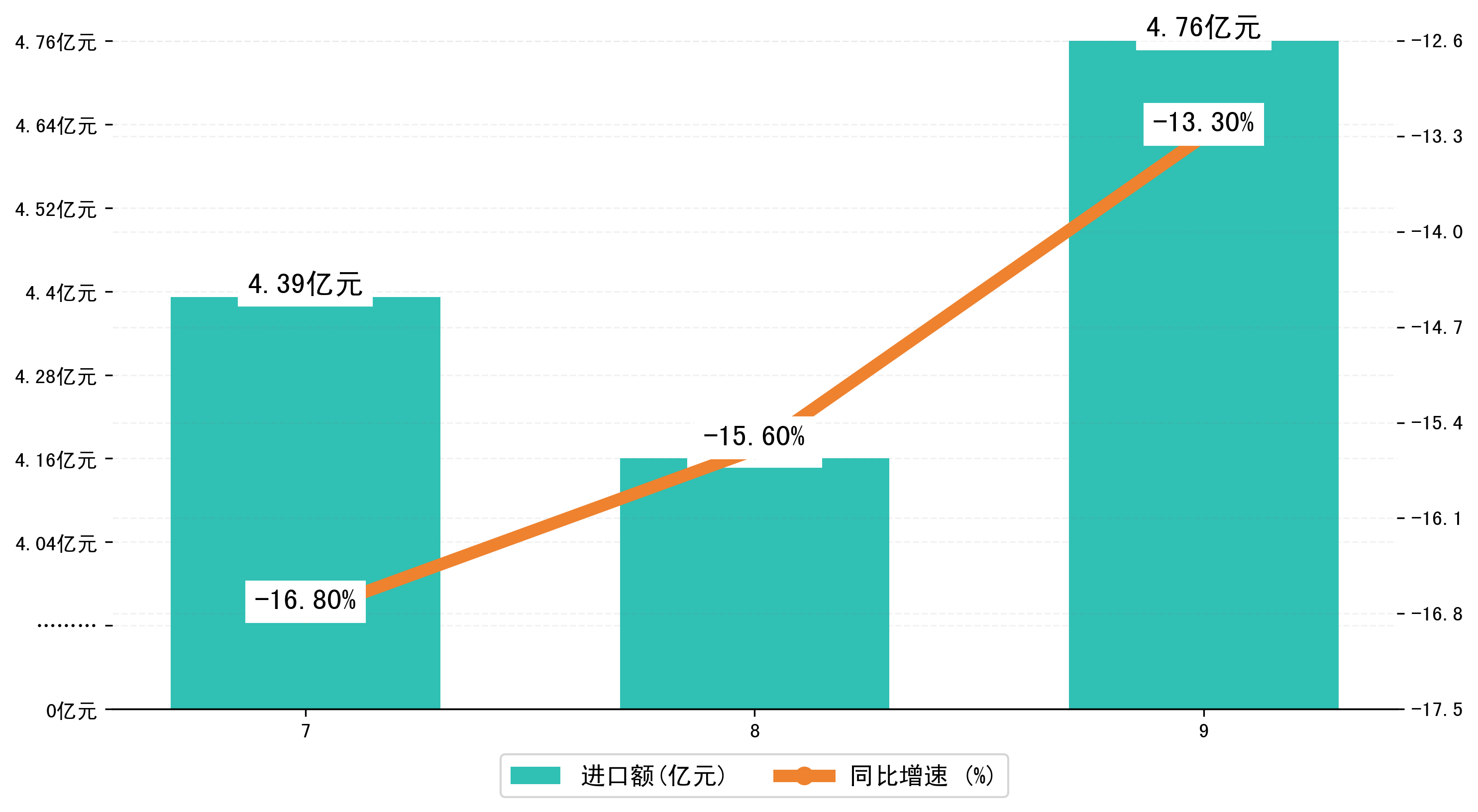 以人民币计,2025年1-9月滁州市进口额为36,7288.881万元,相比上年同期减少了5,6548.5282万元,同比减少了-13.30%。