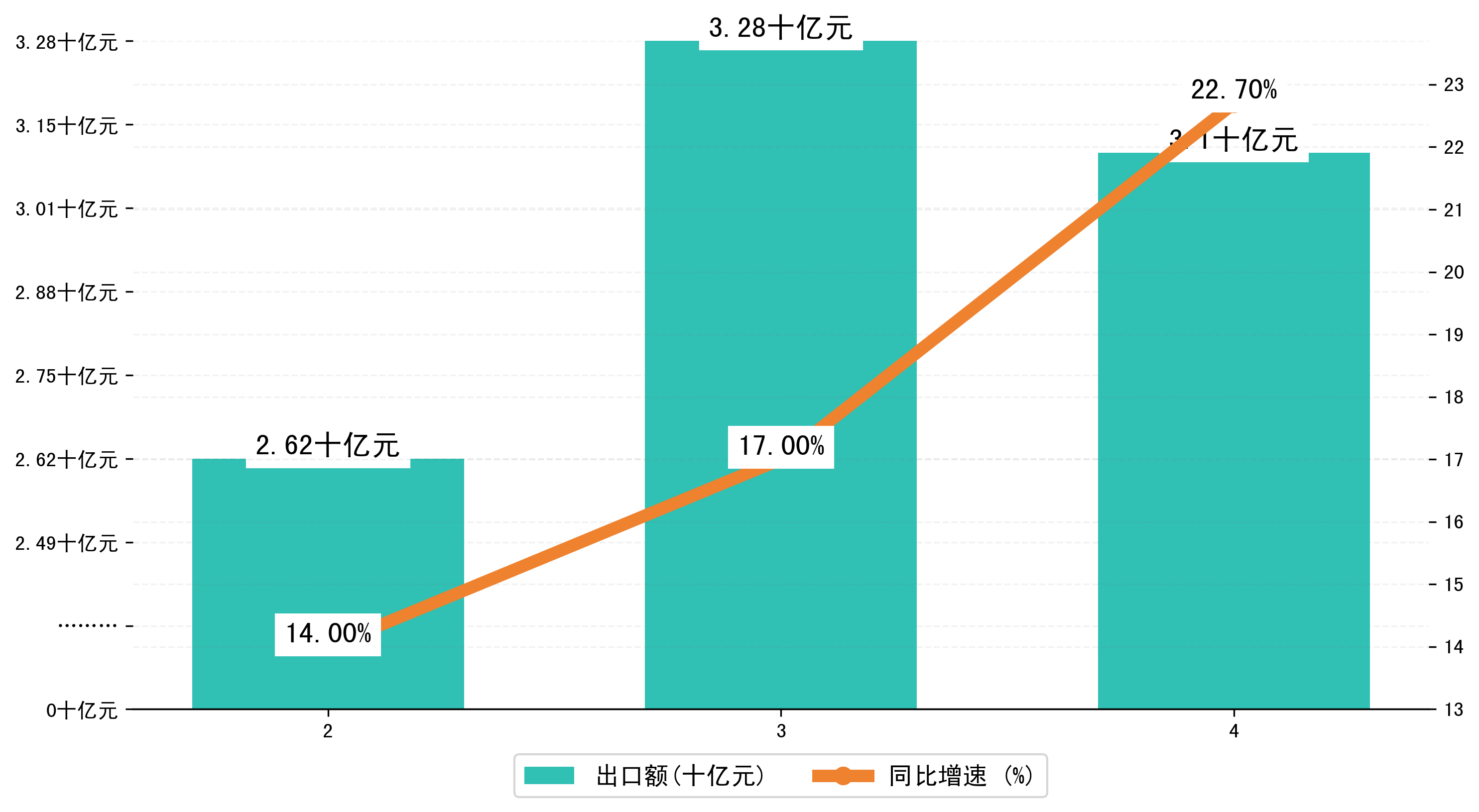 以美元计,2023年1-4月滁州市贸易差额为14,9277,4997万美元(贸易顺差),相比上年同期增加了3,0137,4774万美元,同比增加25.3%。