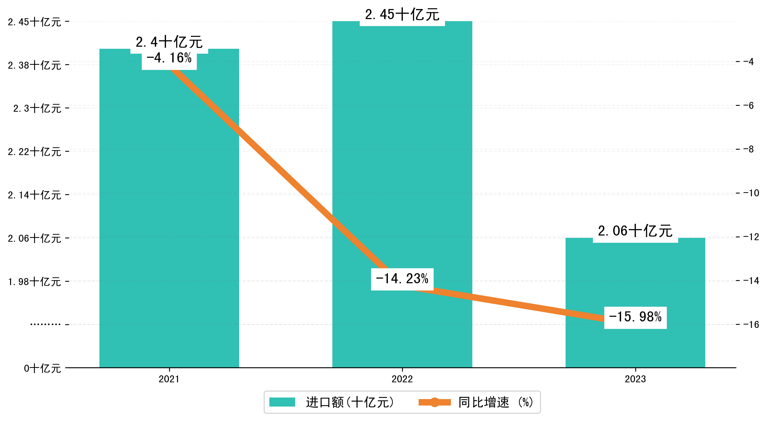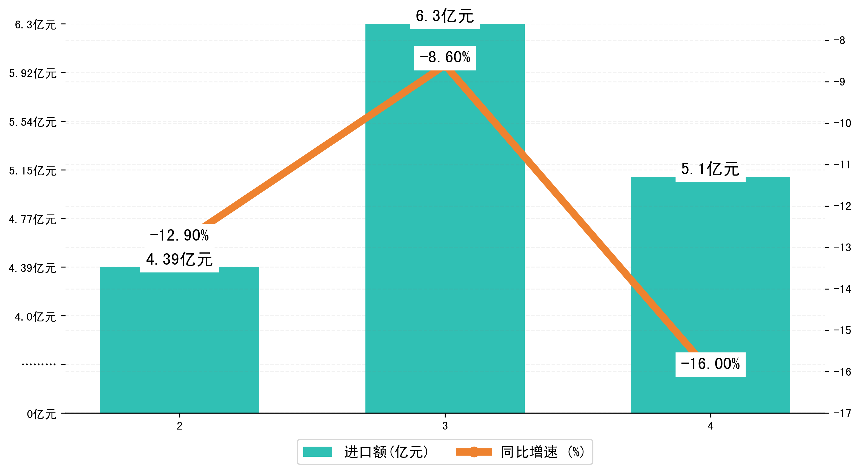 以人民币计,2023年1-4月滁州市进口额为20,6179.7049万元,相比上年同期减少了3,9219.1871万元,同比减少了-16.00%。
