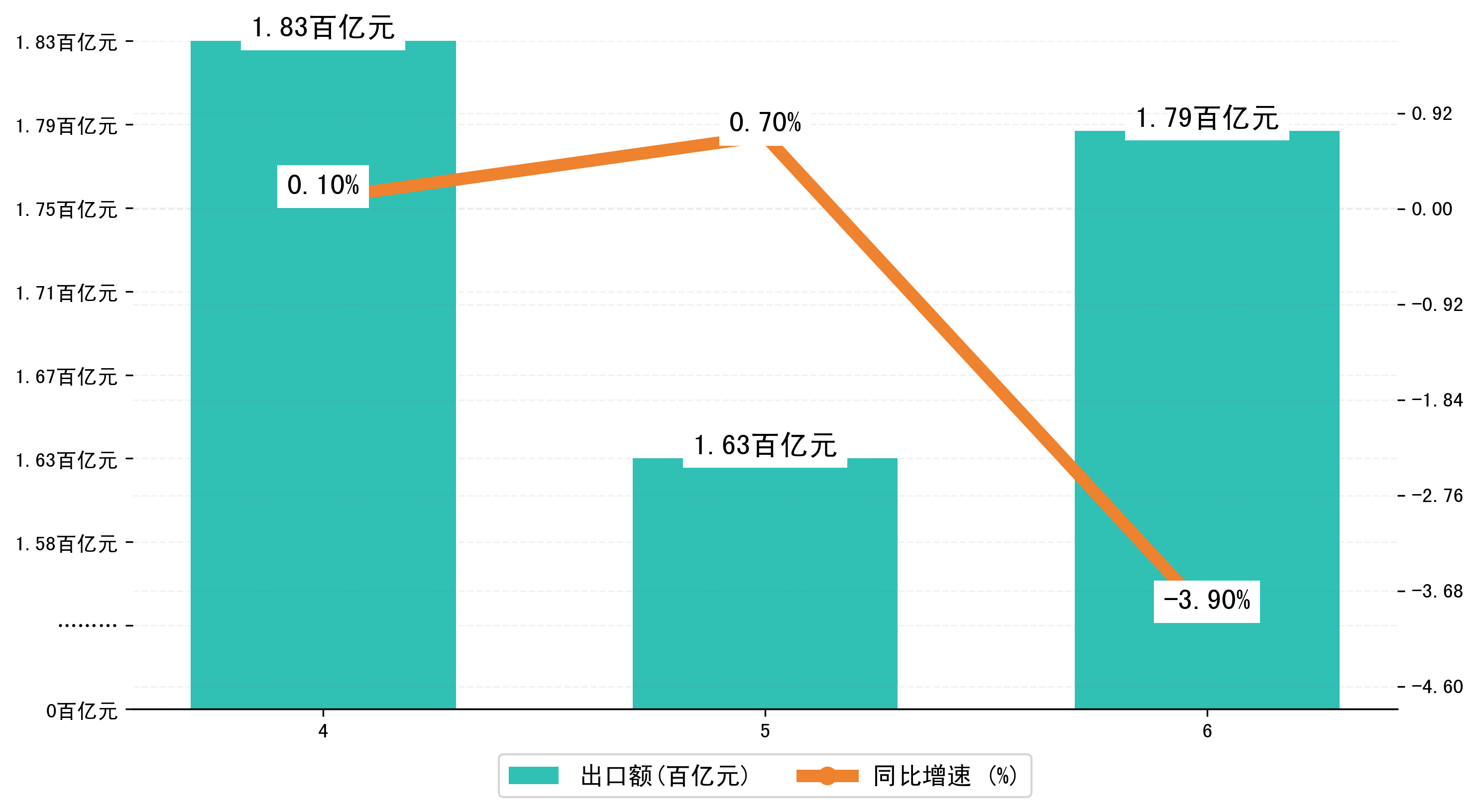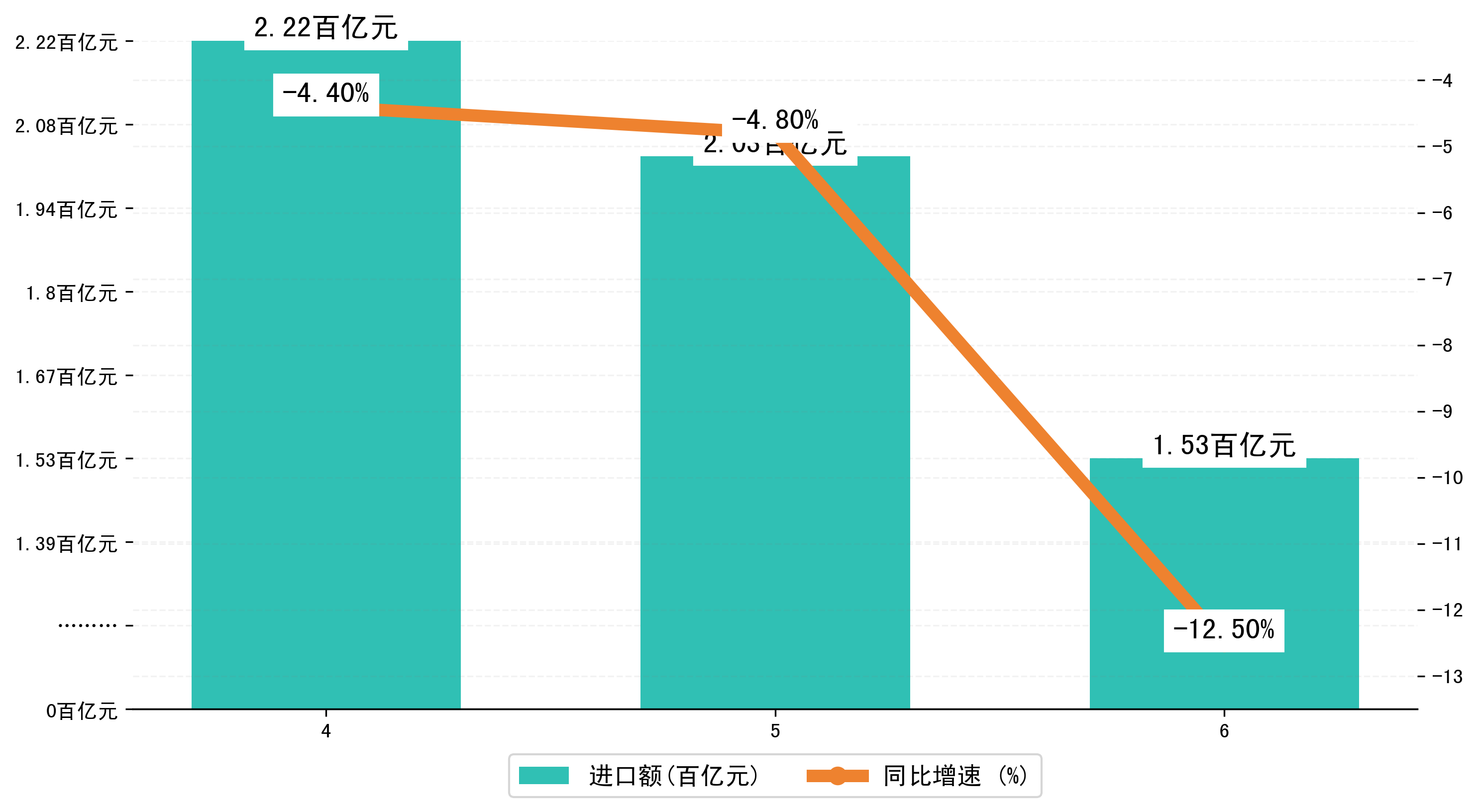 以人民币计,2024年6月大连市进出口总额为331,4640.1171万元,相比上月减少了33,7170.5402万元;相比上年同期减少了156,7827.4154万元,同比减少了-8.70%。