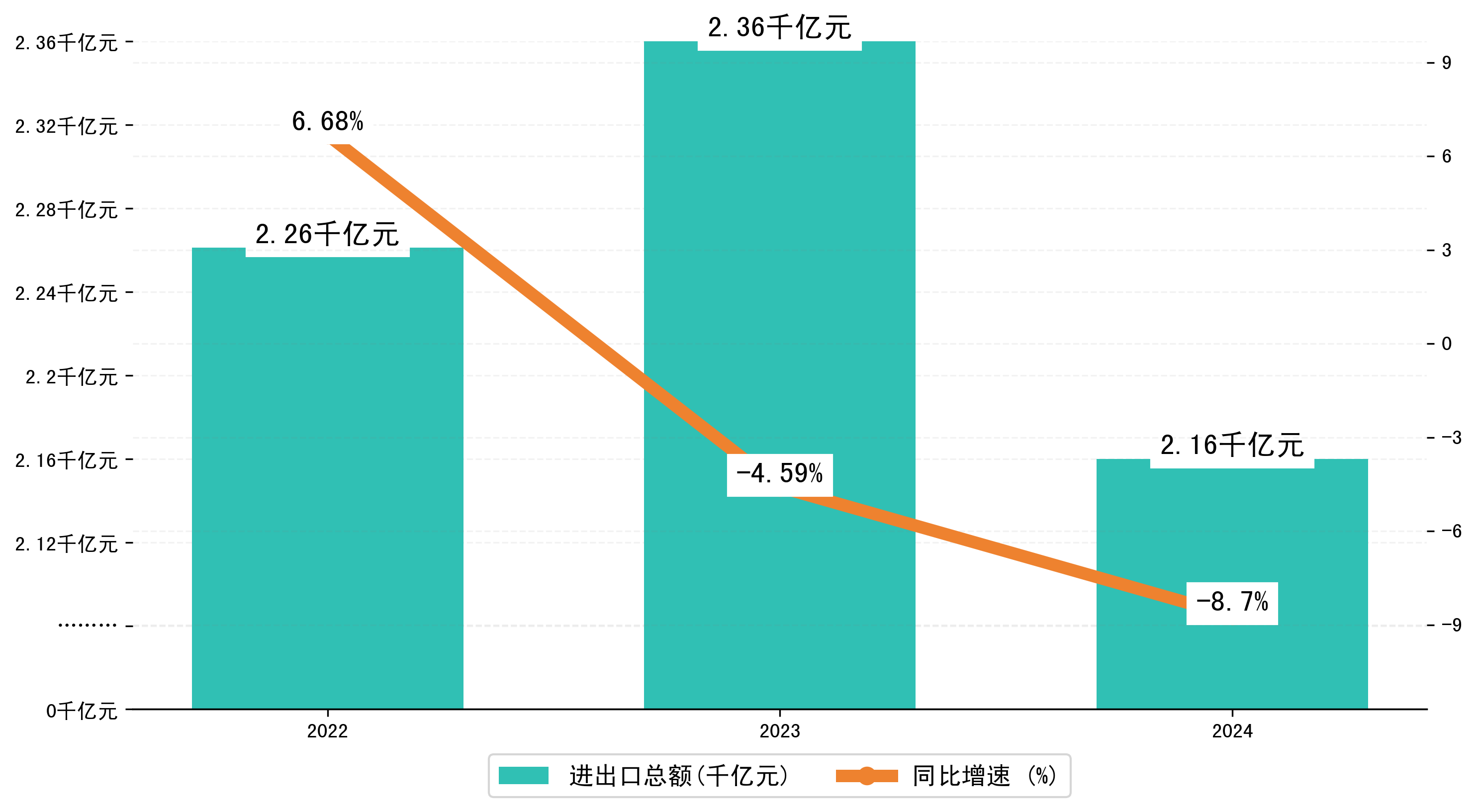 以人民币计,2024年1-6月大连市进出口总额为2159,0108.5658万元,相比上年同期减少了205,6621.9431万元,同比减少了-8.70%。
