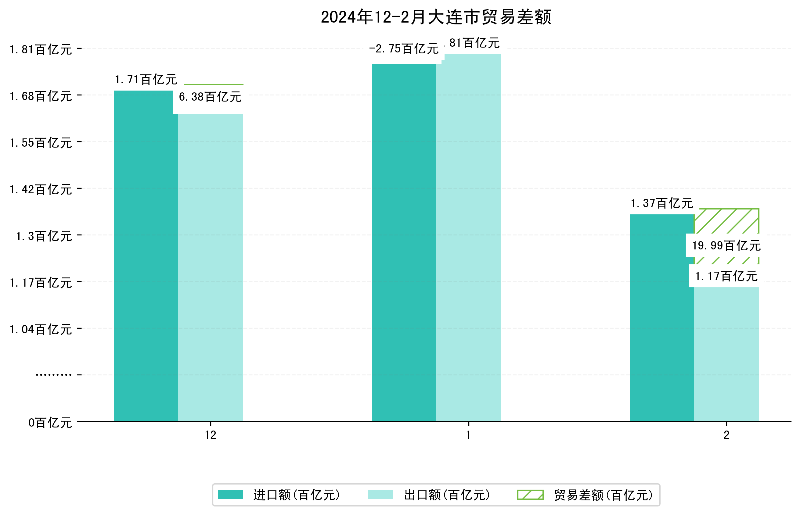 一、2024年2月大连市单月出口总额及进出口差额统计分析