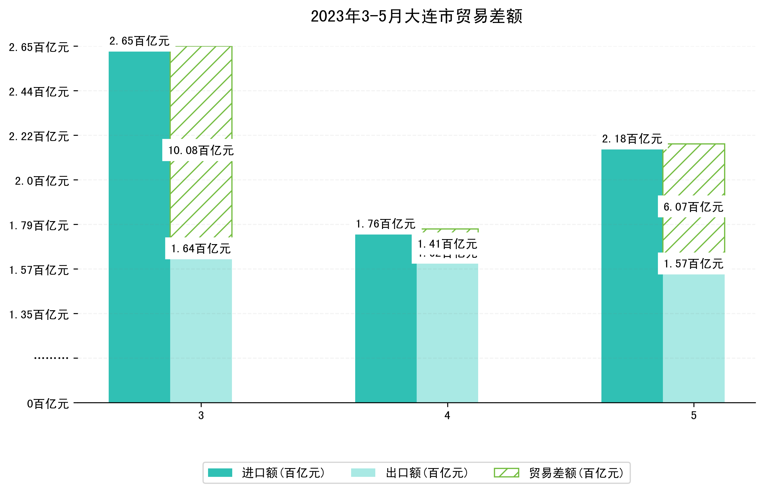 以人民币计,2023年5月大连市贸易差额为60,7301,4434万元(贸易逆差),相比上月减少了46,6289,8254万元,即6,7477,3698万美元;相比上年同期增加了7,0972,6178万元,同比增加-10.46%。