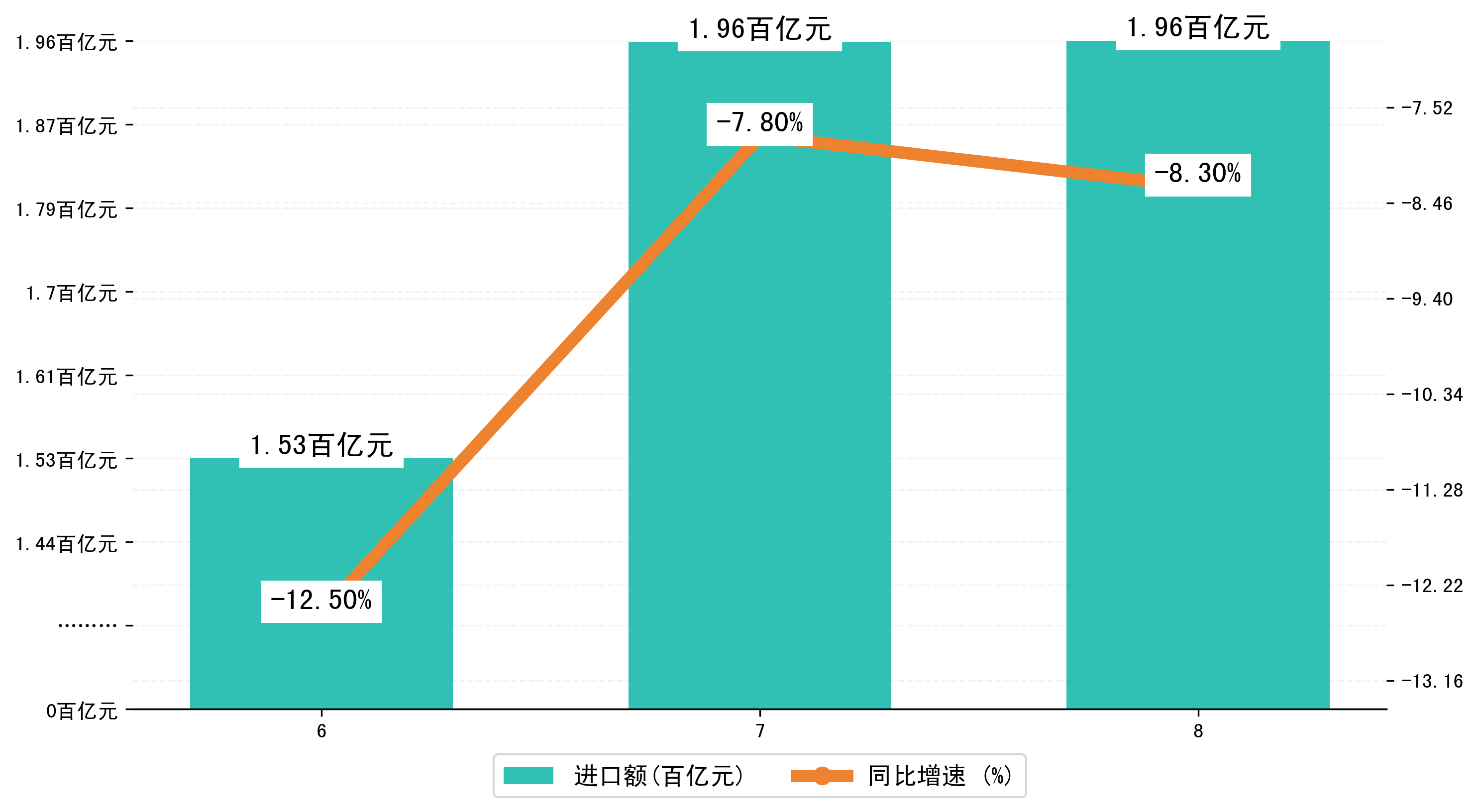 以人民币计,2024年8月大连市进口额为196,1646.2756万元,相比上月增加了1454.7284万元;相比上年同期减少了25,2576.789万元,同比减少了-8.30%。