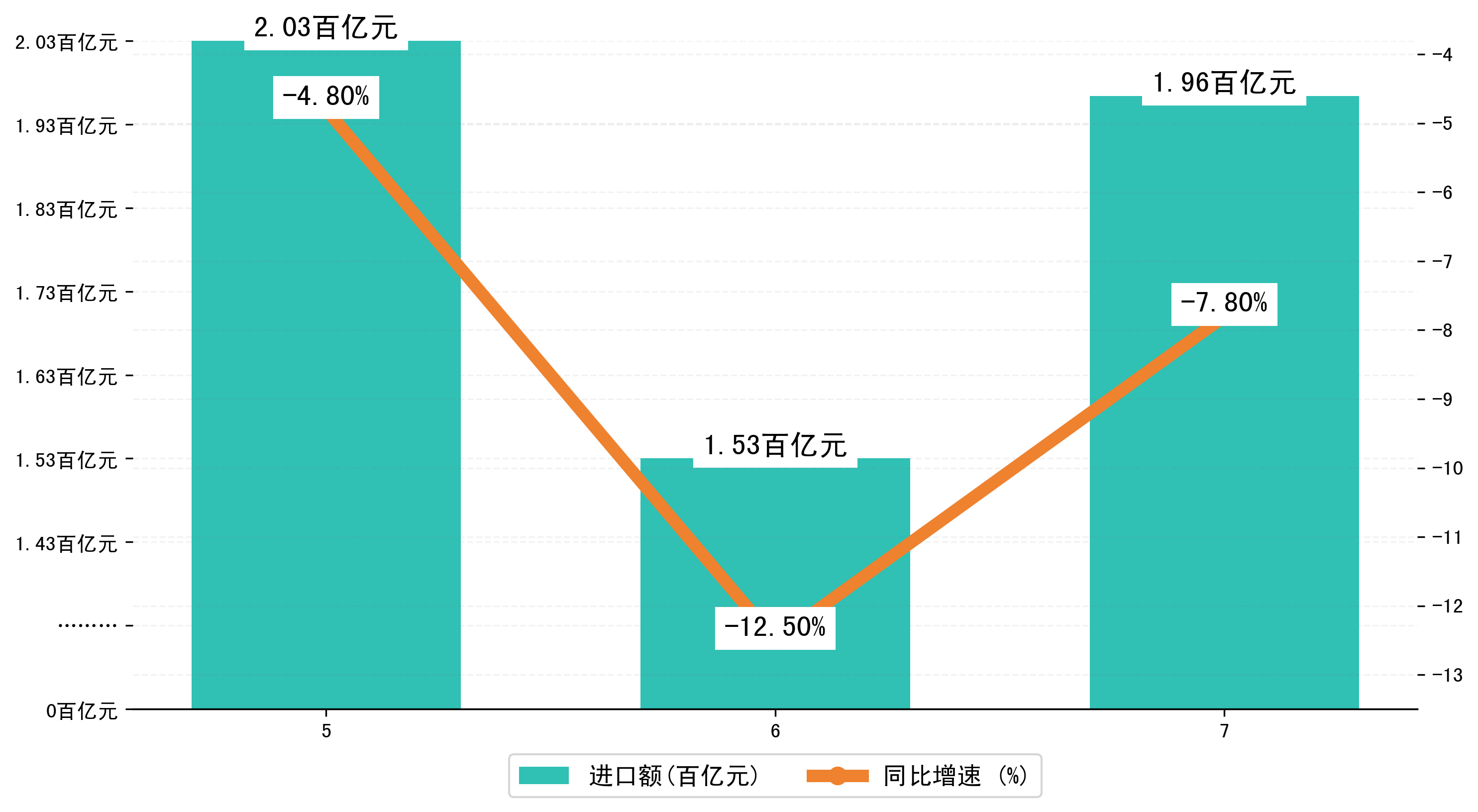 以人民币计,2024年7月大连市进口额为196,0191.5472万元,相比上月增加了43,2803.6772万元;相比上年同期增加了51,4359.4048万元,同比减少了-7.80%。
