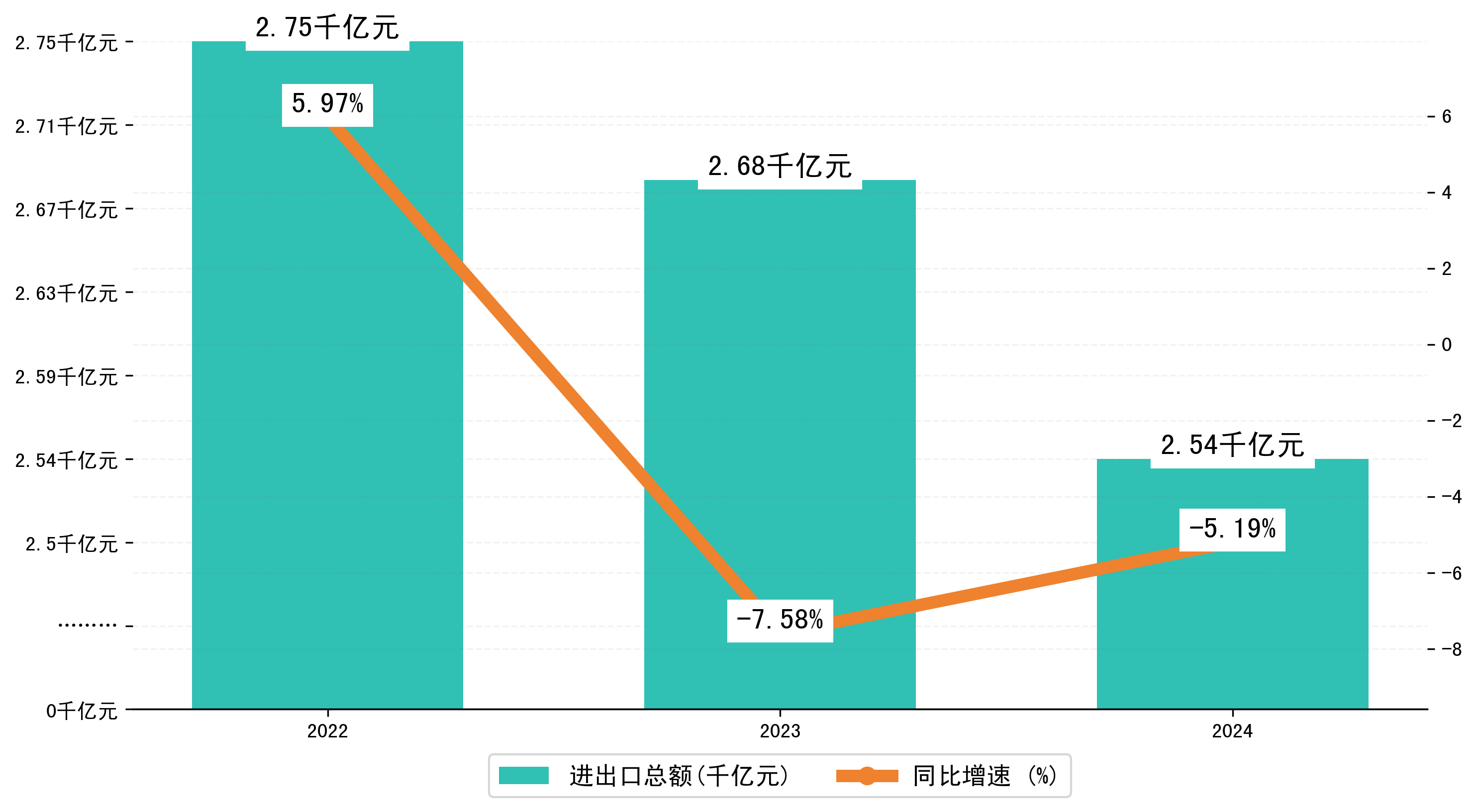 以人民币计,2024年1-7月大连市进出口总额为2544,1377.2756万元,相比上年同期减少了139,2671.4736万元,同比减少了-5.20%。