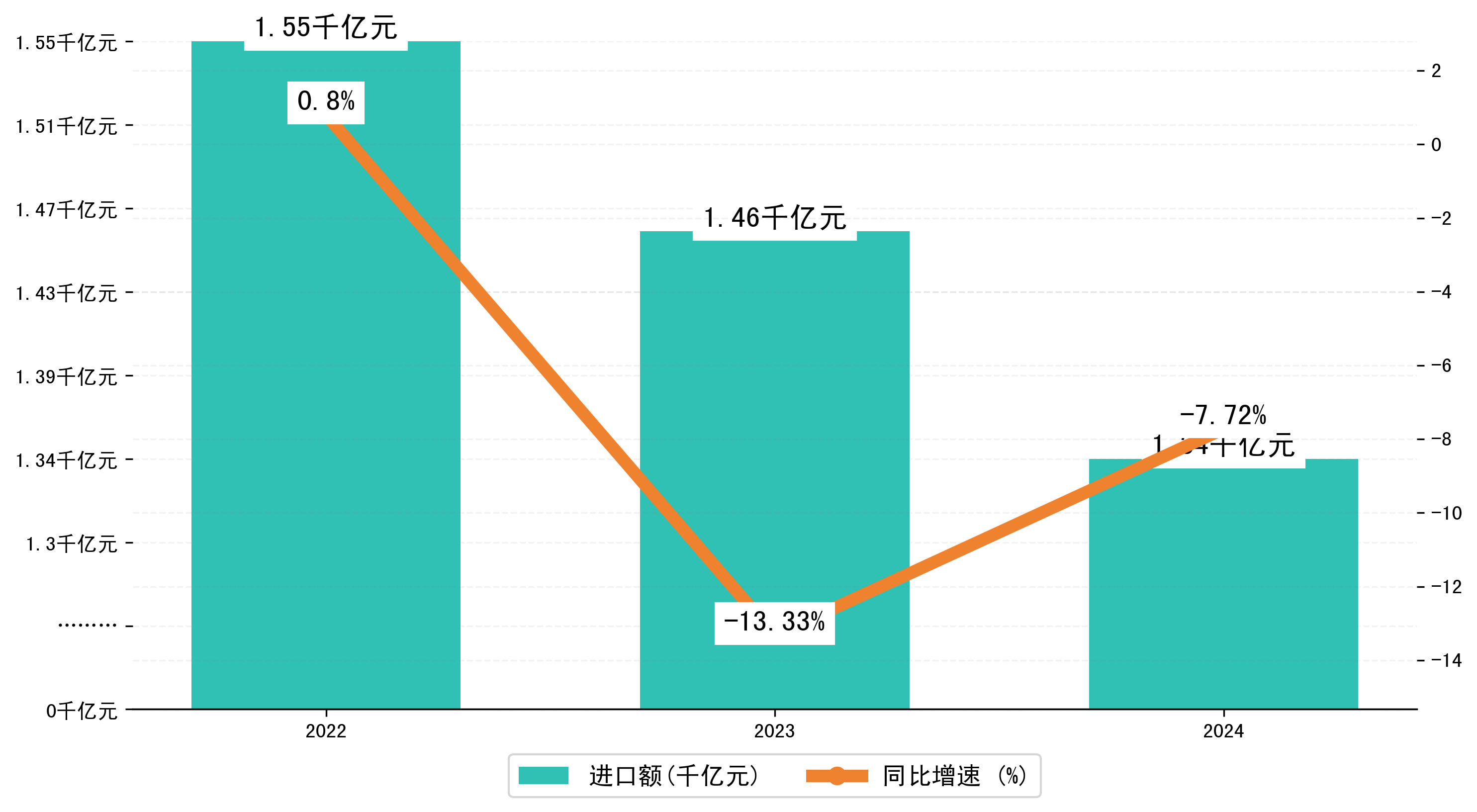 以人民币计,2024年1-7月大连市进口额为1344,3330.8693万元,相比上年同期减少了112,5333.3704万元,同比减少了-7.80%。