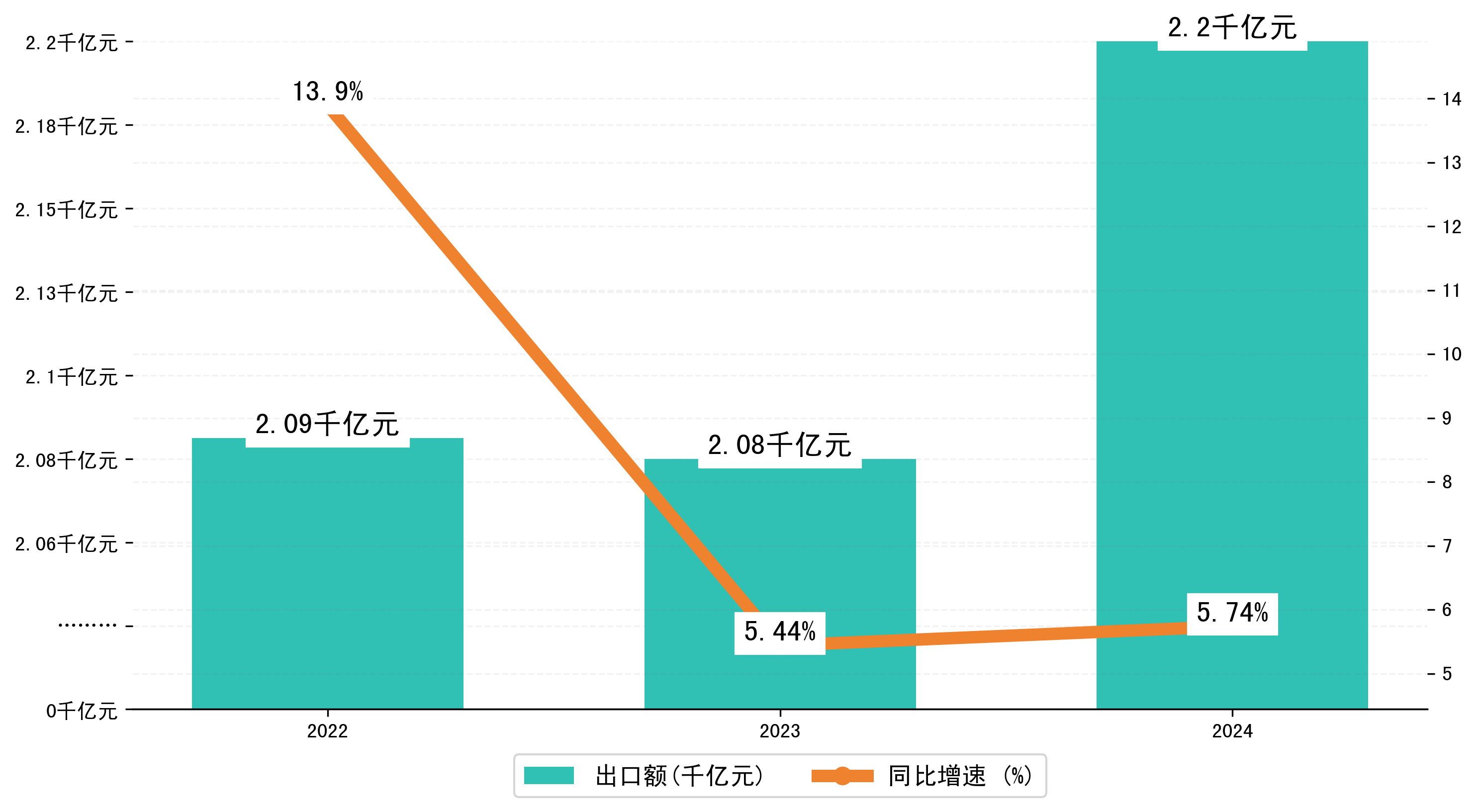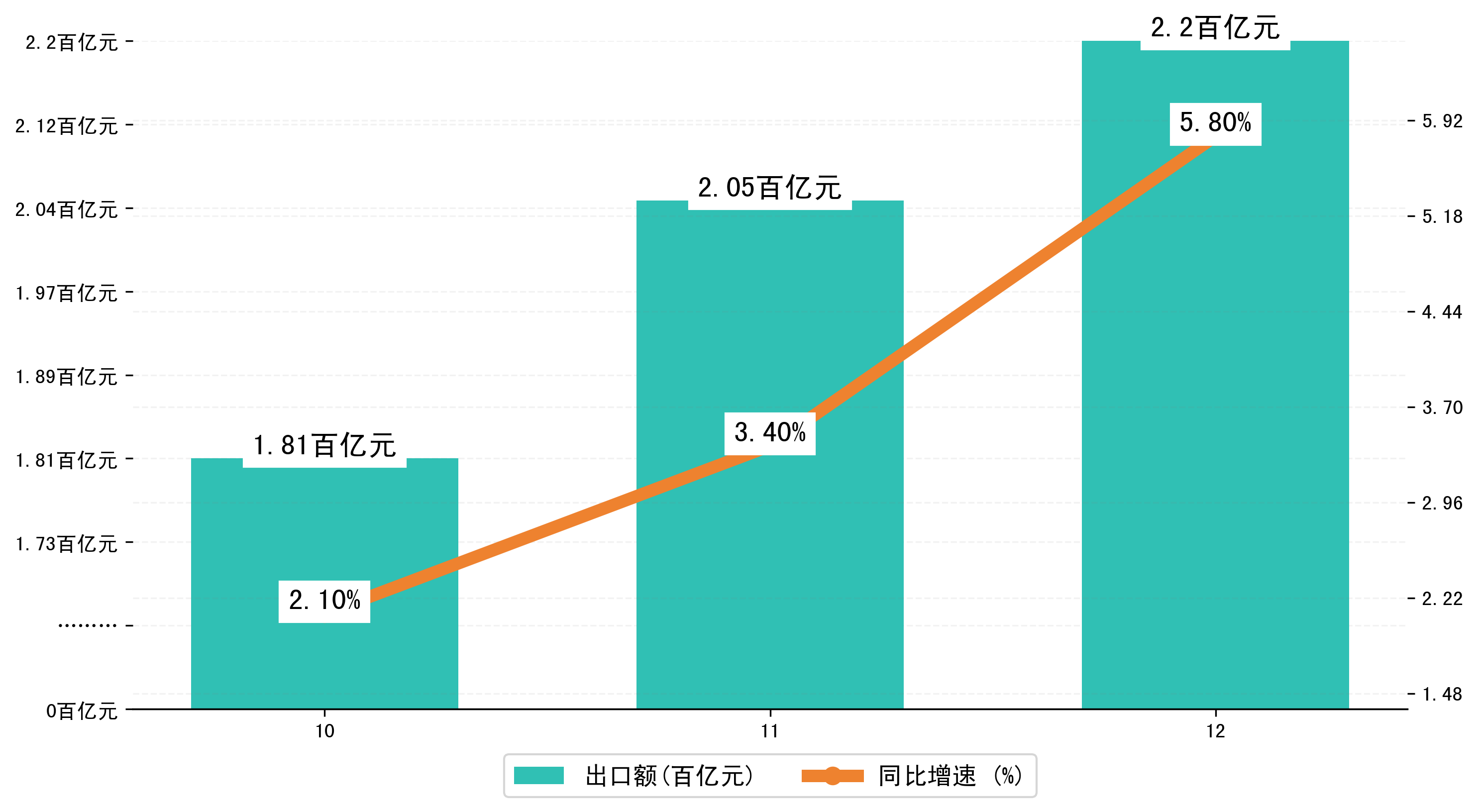 以人民币计,2024年1-12月大连市出口额为2200,1459.5949万元,相比上年同期增加了119,3744.1595万元,同比增加了5.80%。