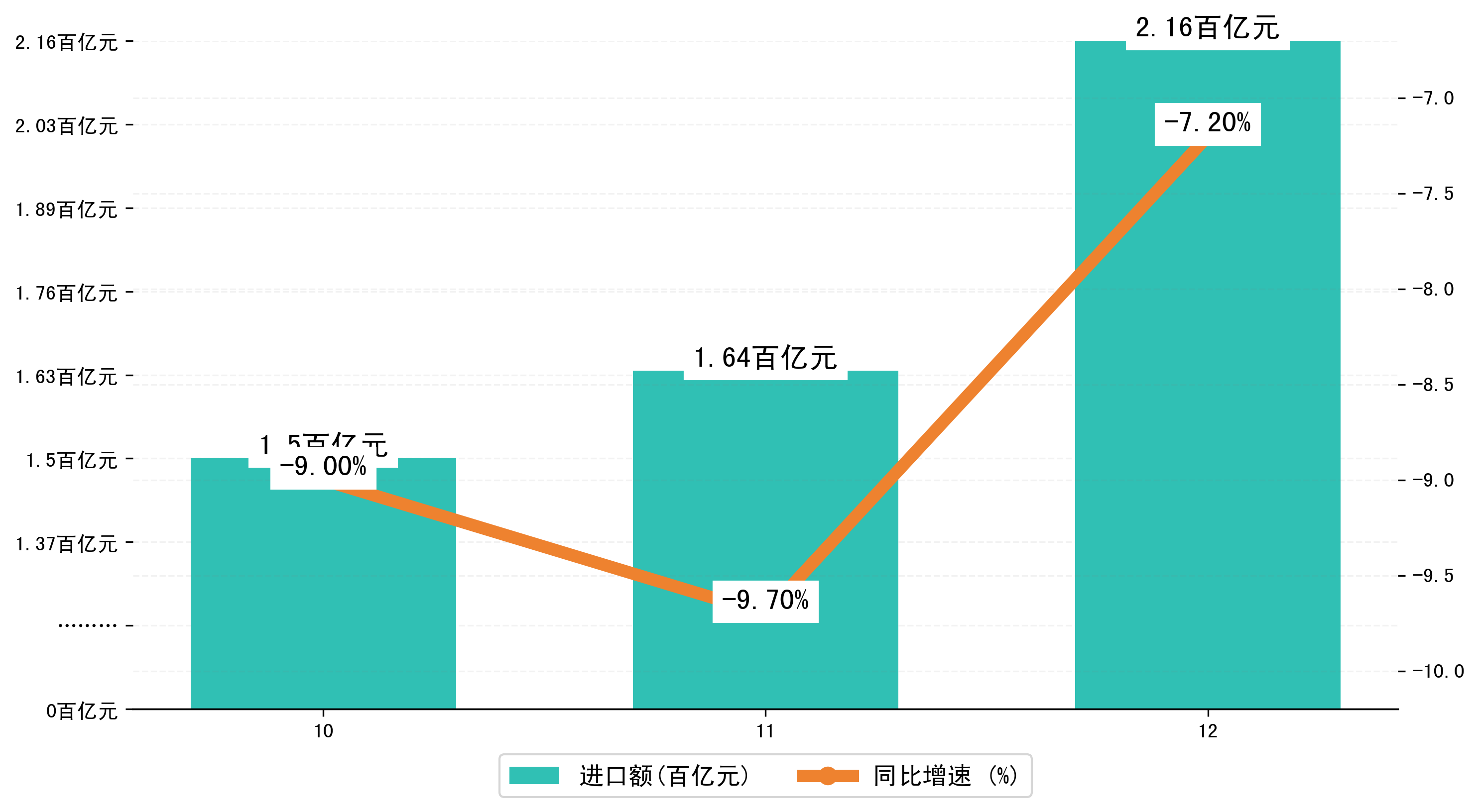 以人民币计,2024年12月大连市进口额为215,9193.4485万元,相比上月增加了52,2516.0105万元;相比上年同期增加了45,0779.5974万元,同比减少了-7.20%。