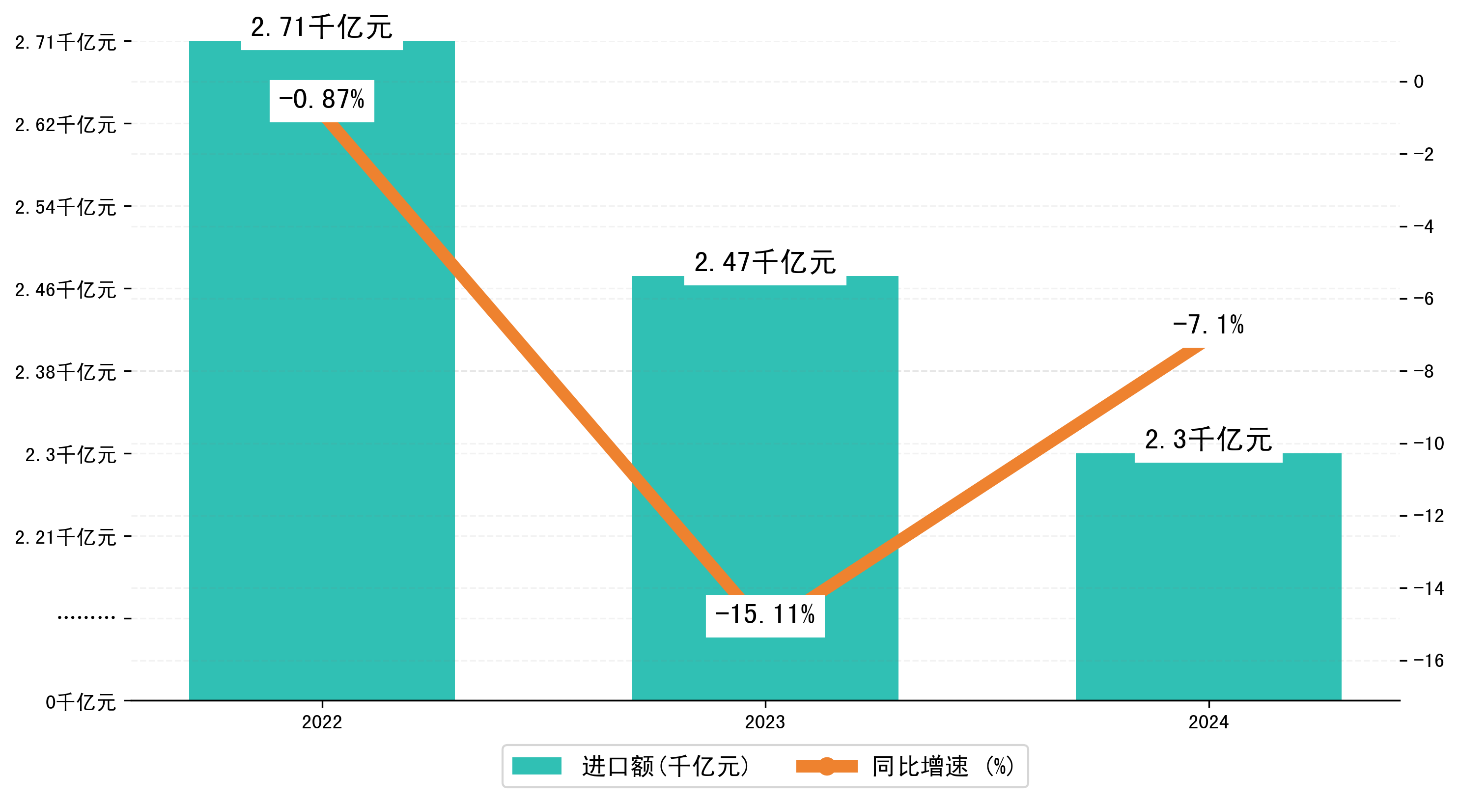 以人民币计,2024年1-12月大连市进口额为2296,5352.978万元,相比上年同期减少了175,5332.8398万元,同比减少了-7.20%。