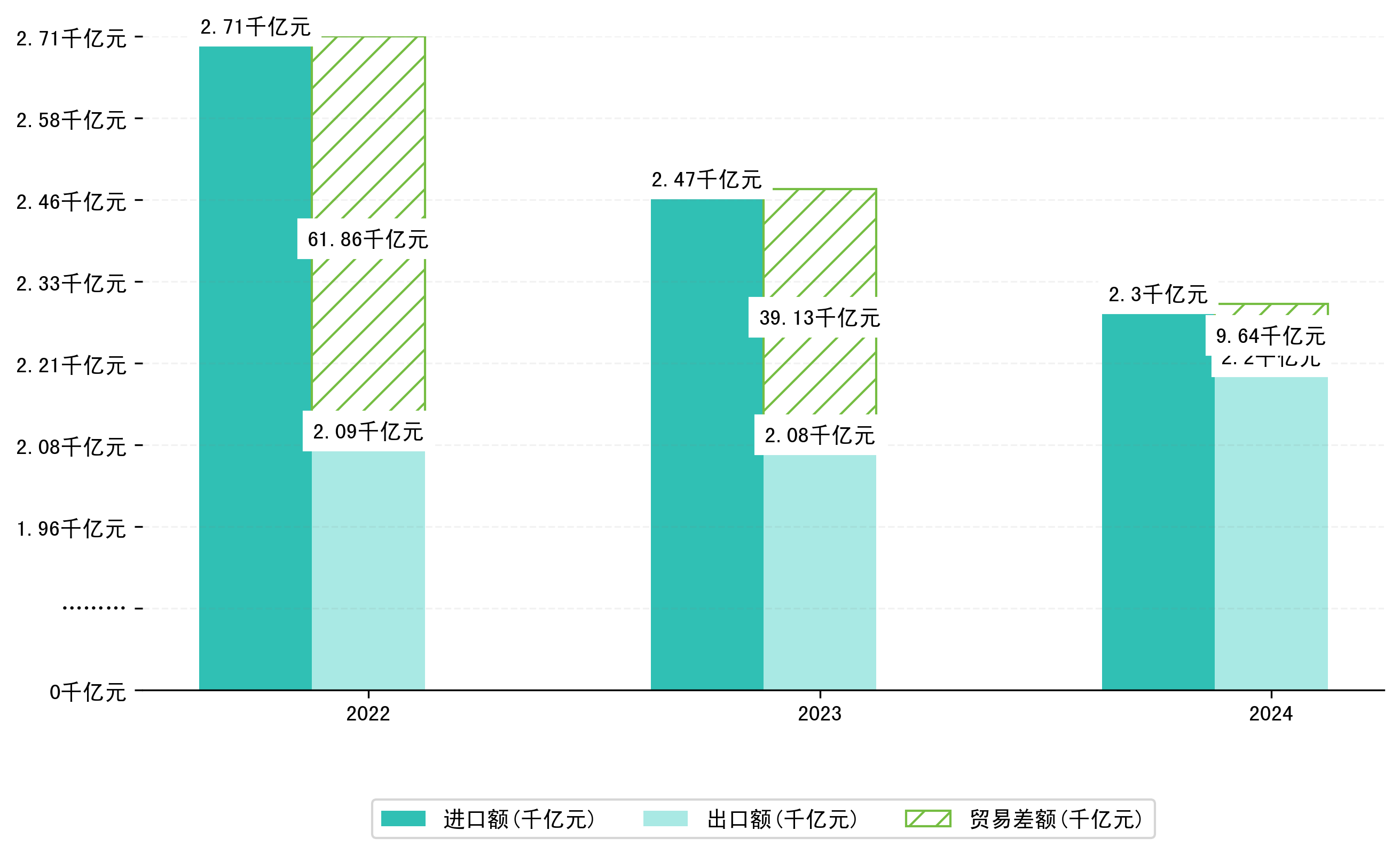 以人民币计,2024年1-12月大连市贸易差额为96,3893,3831万元(贸易逆差),相比上年同期增加了294,9076,9993万元,同比增加-75.37%。