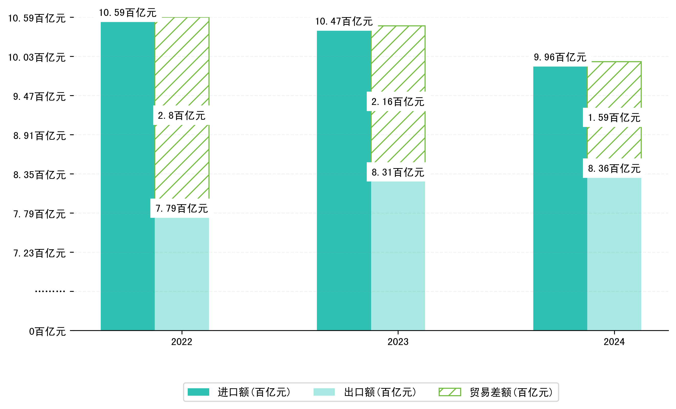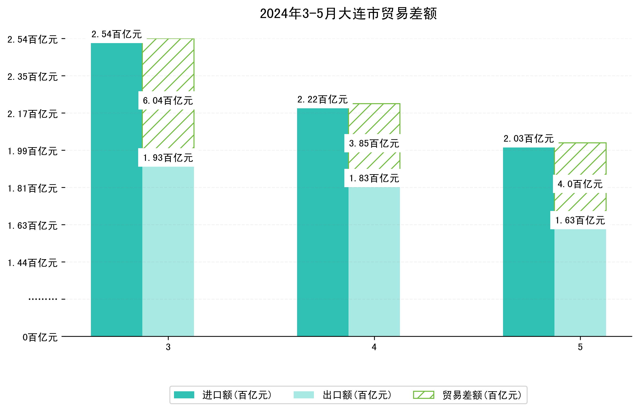 以美元计,2024年1-5月大连市贸易差额为22,4627,3999万美元(贸易逆差),相比上年同期增加了8,9810,3408万美元,同比增加-28.56%。