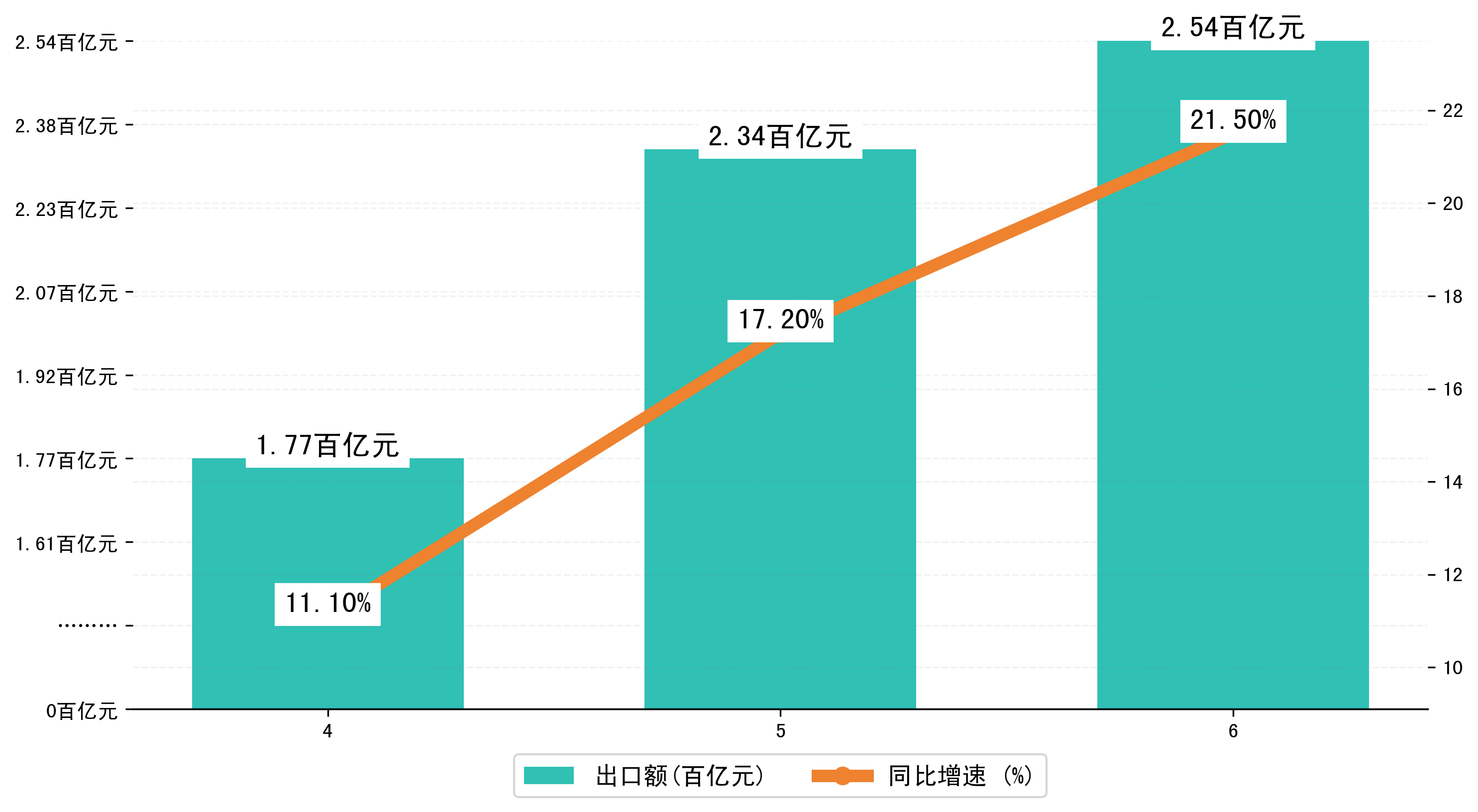 以人民币计,2025年6月大连市出口额为253,6004.4737万元,相比上月增加了20,0916.5081万元;相比上年同期增加了74,8752.2266万元,同比增加了21.50%。