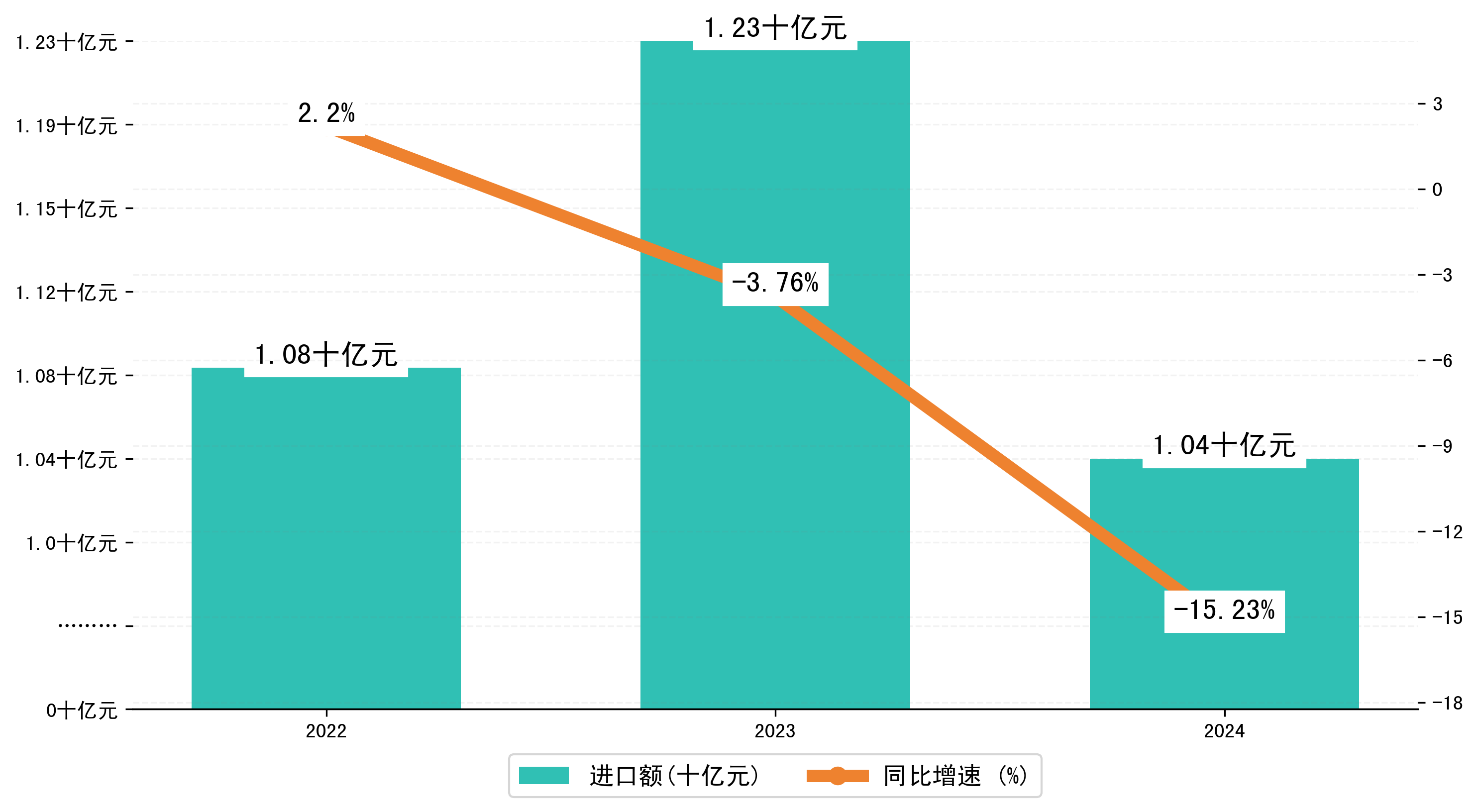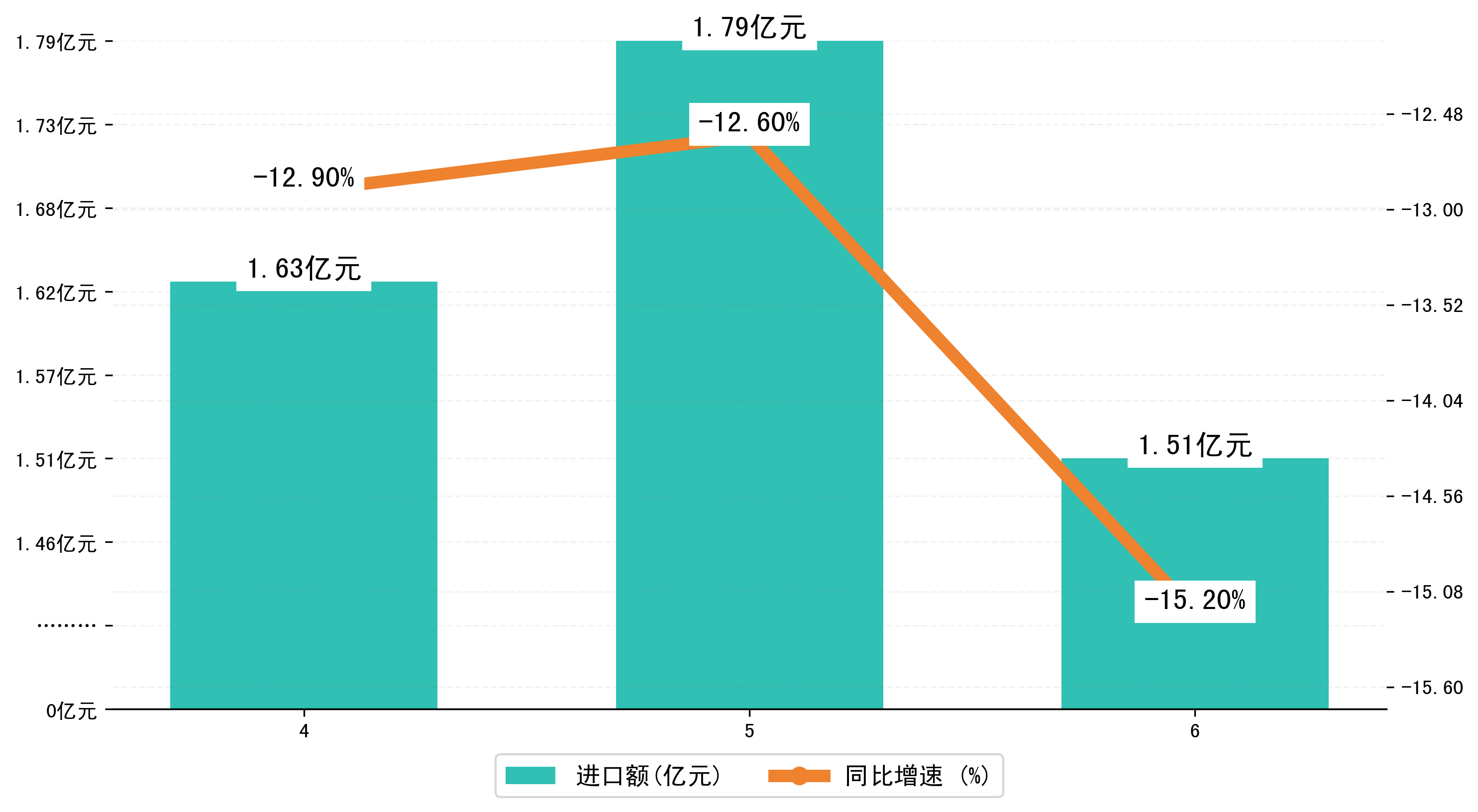 以人民币计,2024年1-6月丹东市进口额为10,4189.1233万元,相比上年同期减少了1,8718.9846万元,同比减少了-15.20%。