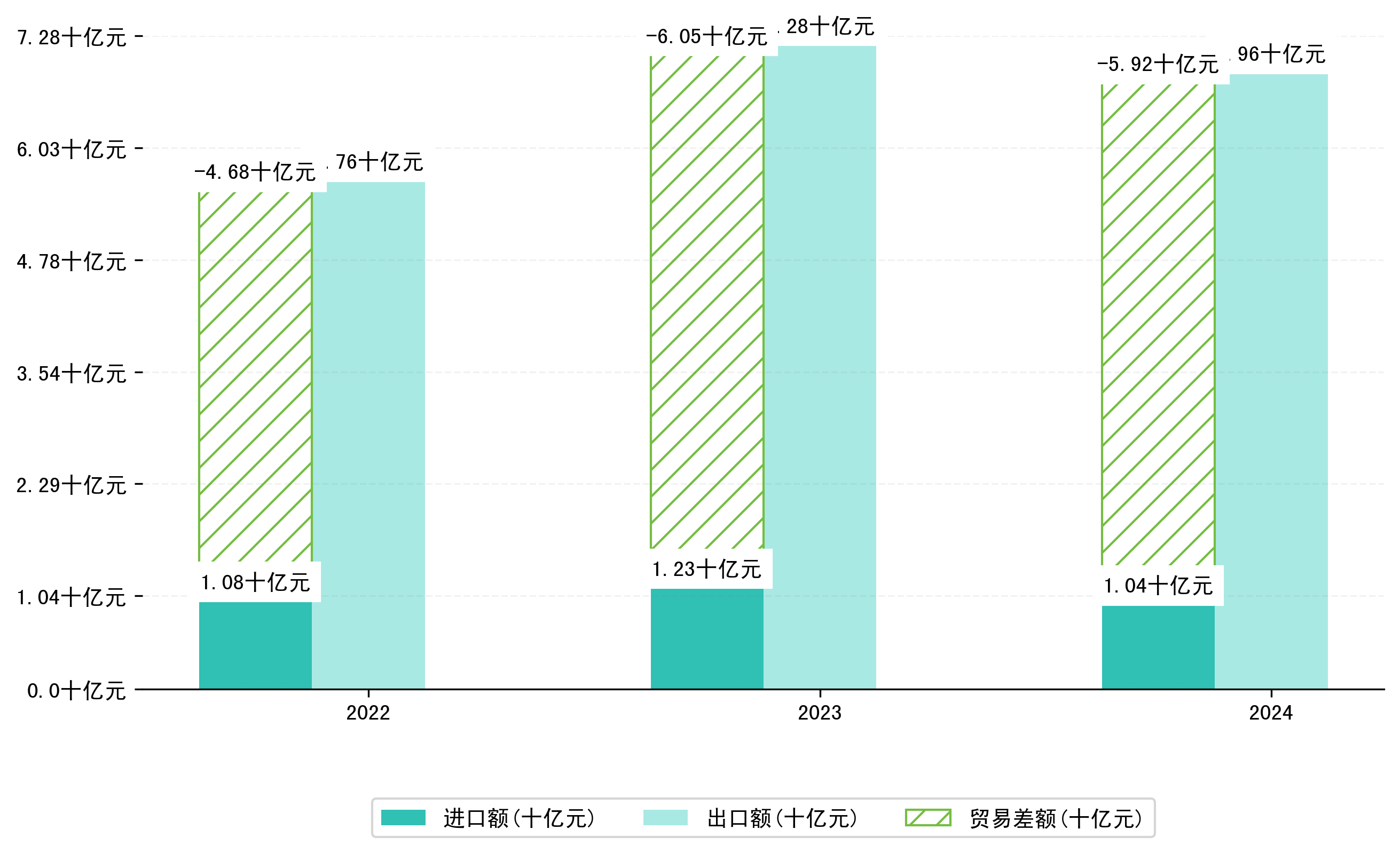 以人民币计,2024年1-6月丹东市贸易差额为59,2163,2541万元(贸易顺差),相比上年同期减少了1,2428,9102万元,同比减少-2.06%。