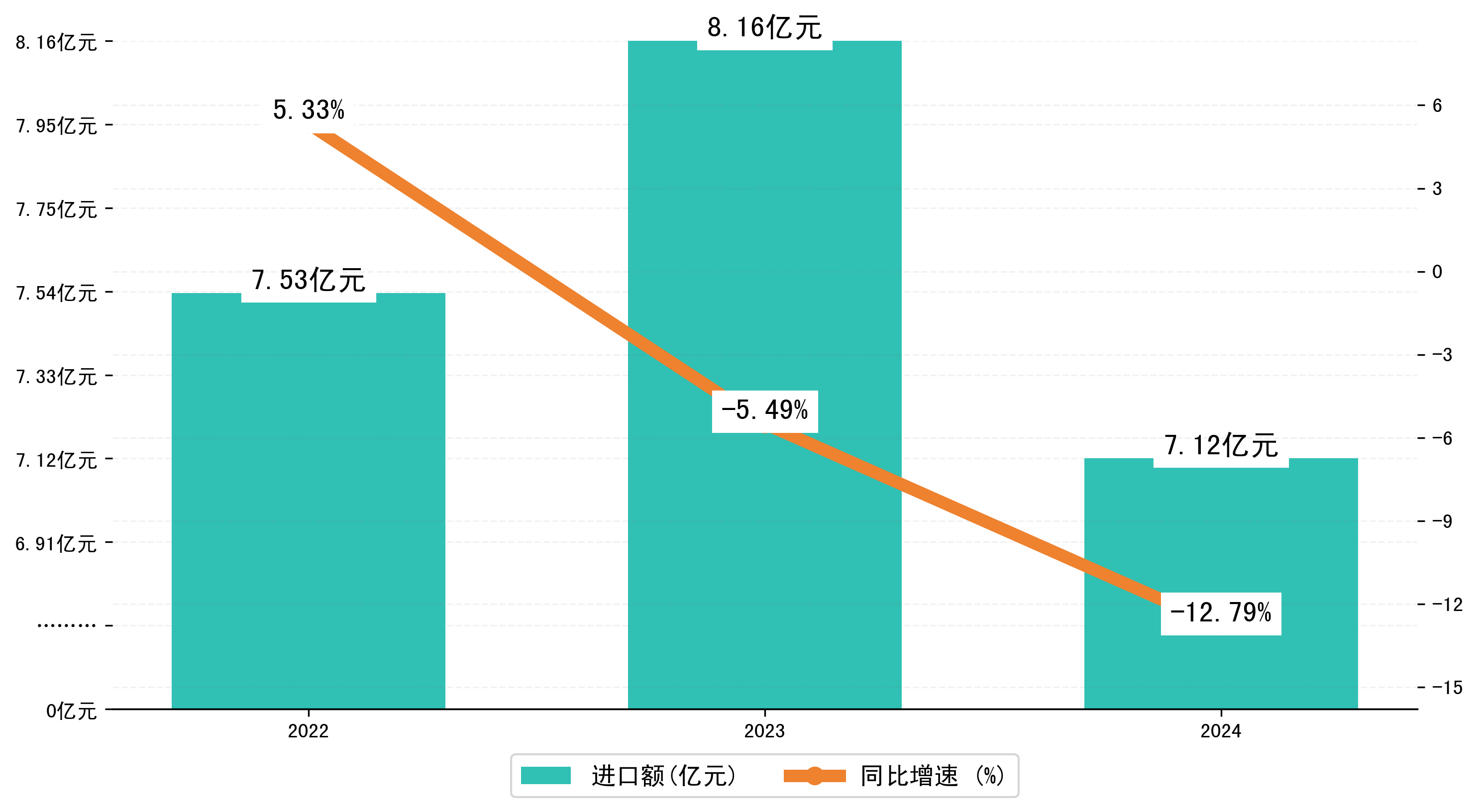 以人民币计,2024年1-4月丹东市进口额为7,1192.7326万元,相比上年同期减少了1,0443.5244万元,同比减少了-12.90%。
