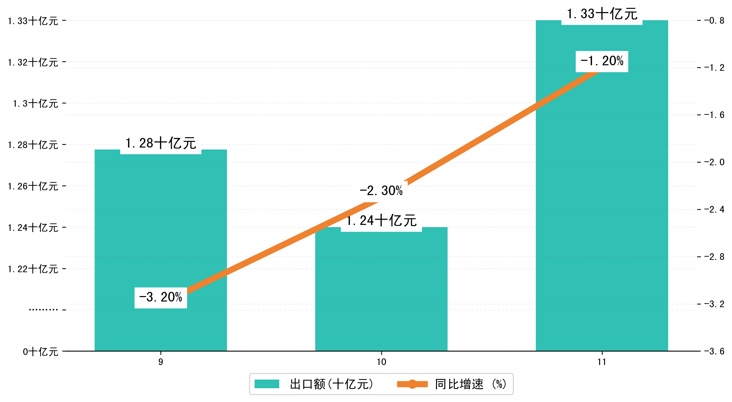 一、2024年11月丹东市单月出口总额及进出口差额统计分析