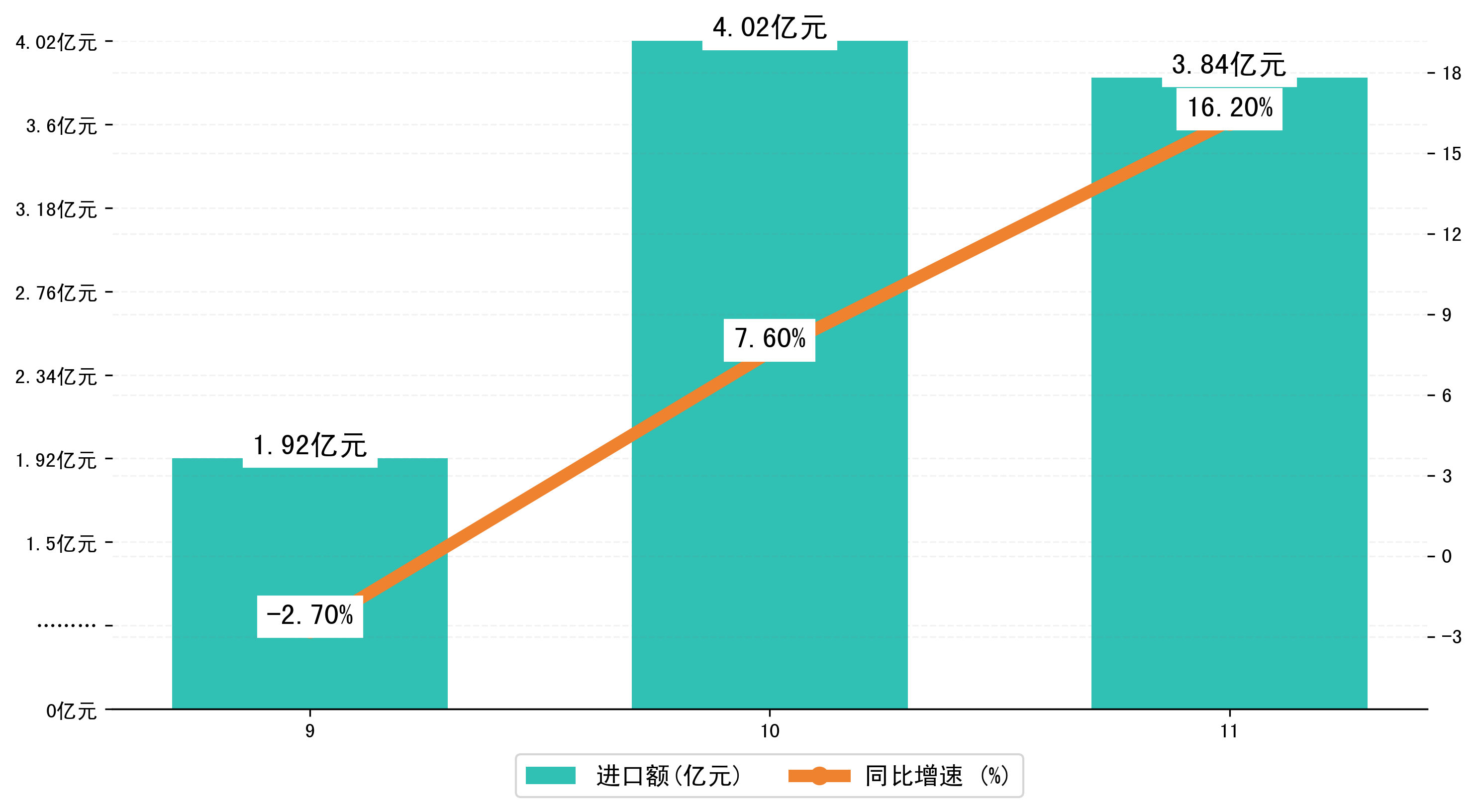 以美元计,2024年11月丹东市进口额为5383.9713万美元,相比上月减少了332.9783万美元;相比上年同期增加了2881.3389万美元,同比增加14.80%。
