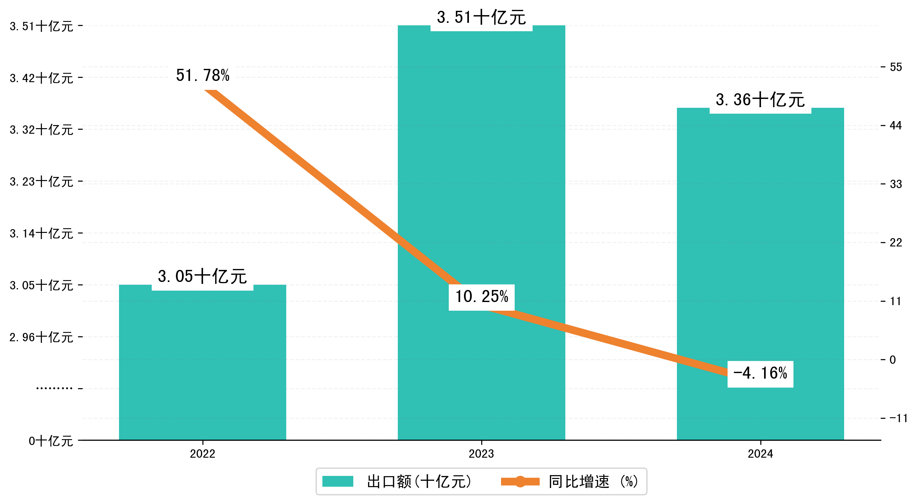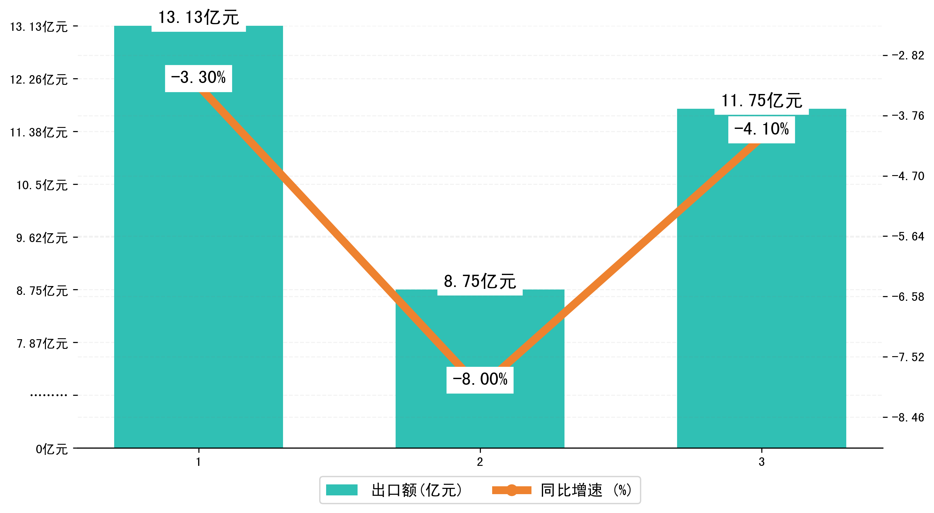 以人民币计,2024年1-3月丹东市出口额为33,6177.8055万元,相比上年同期减少了1,4595.5088万元,同比减少了-4.10%。