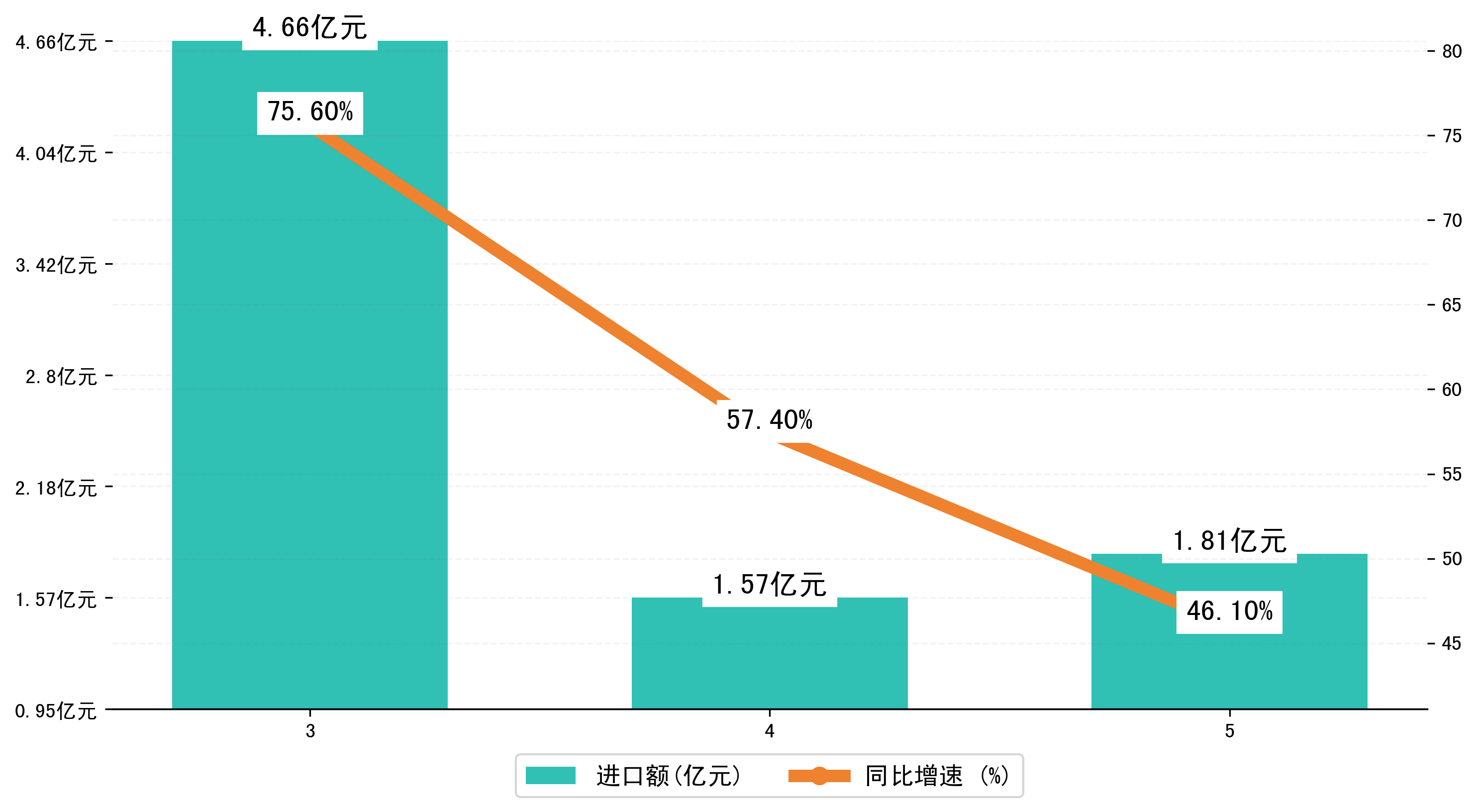 以人民币计,2025年5月丹东市进口额为1,8091.4796万元,相比上月增加了2441.1205万元;相比上年同期增加了191.392万元,同比增加了46.10%。