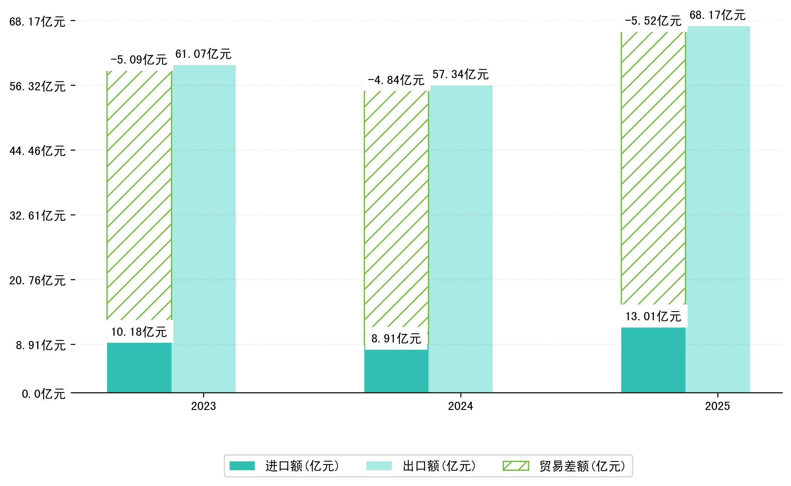 以人民币计,2025年1-5月丹东市贸易差额为55,1578,9426万元(贸易顺差),相比上年同期增加了6,7240,5032万元,同比增加13.88%。