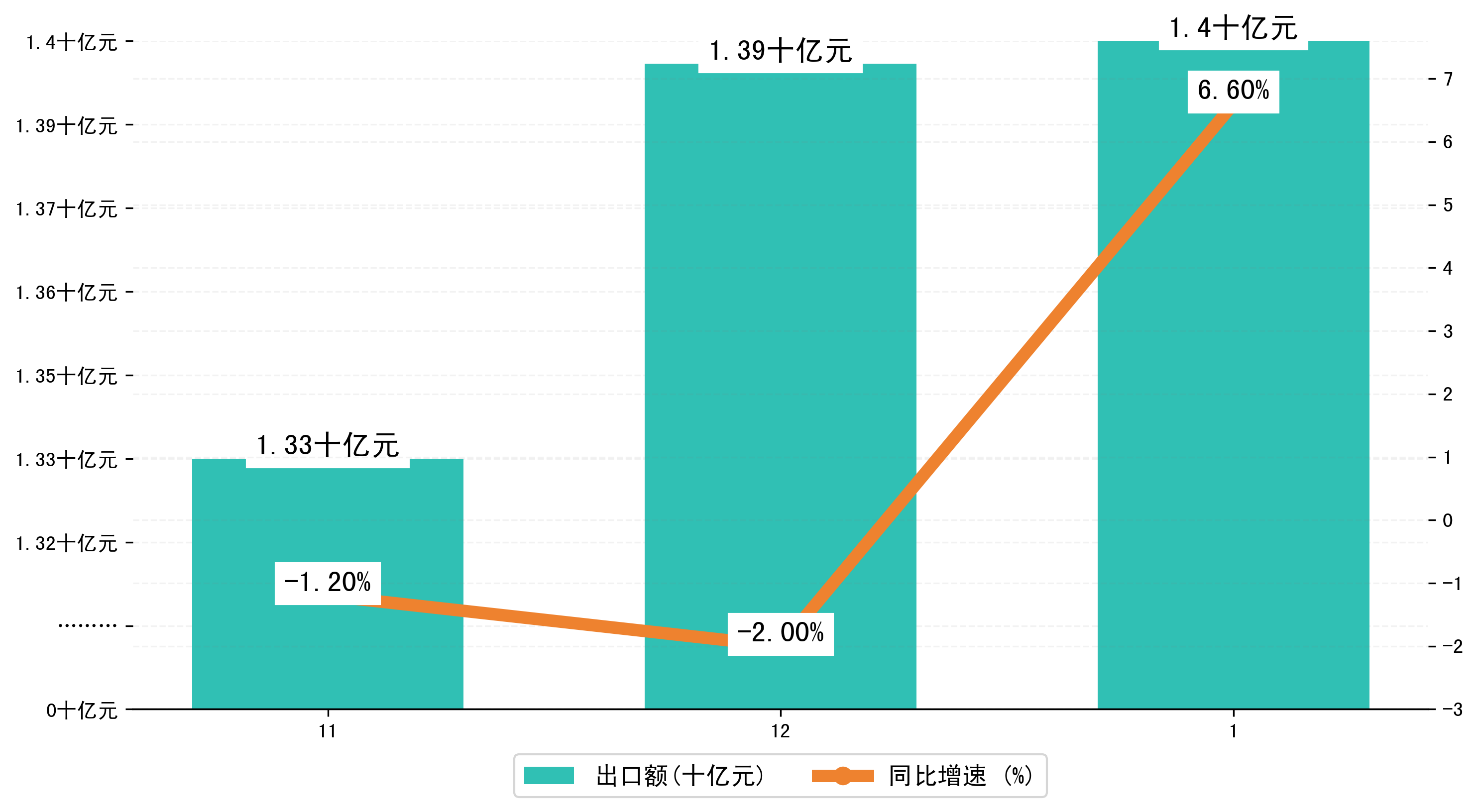 以人民币计,2025年1-1月丹东市出口额为13,9844.8348万元,相比上年同期增加了8513.1544万元,同比增加了6.60%。
