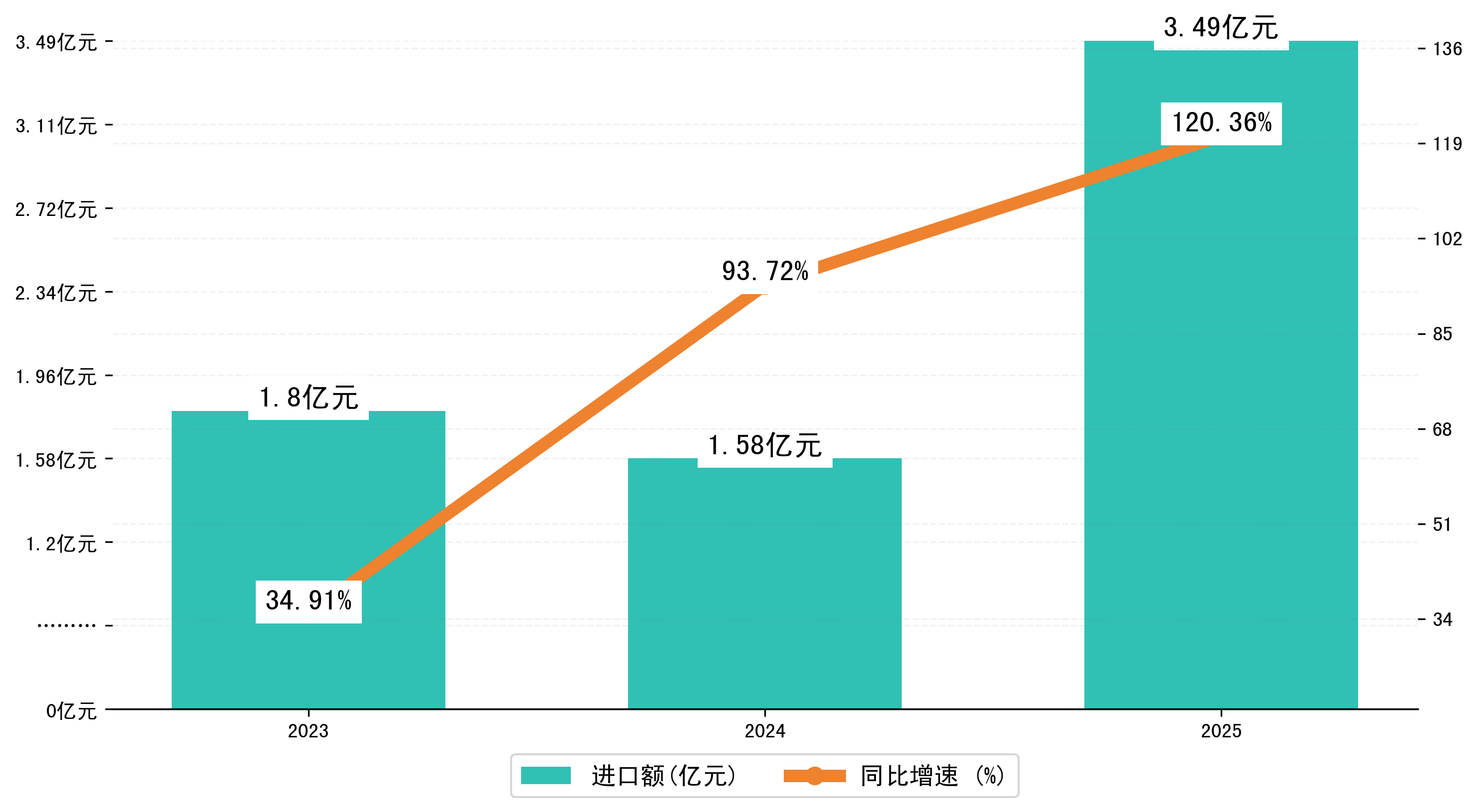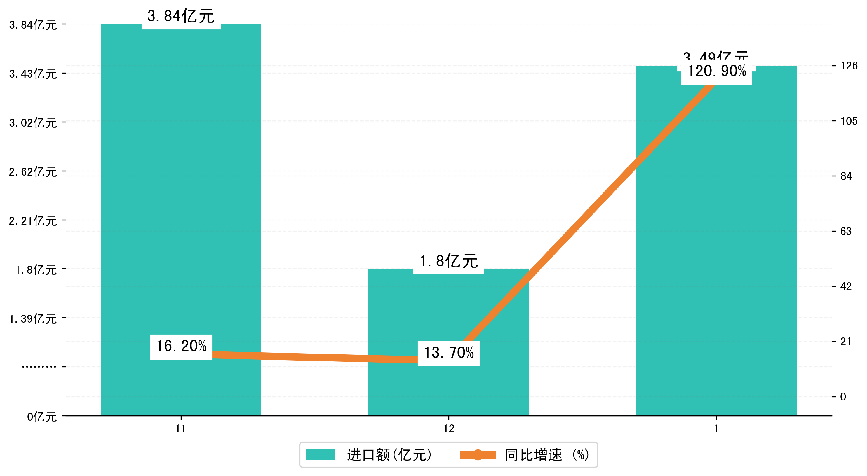 以人民币计,2025年1-1月丹东市进口额为3,4860.9823万元,相比上年同期增加了1,9041.0万元,同比增加了120.90%。