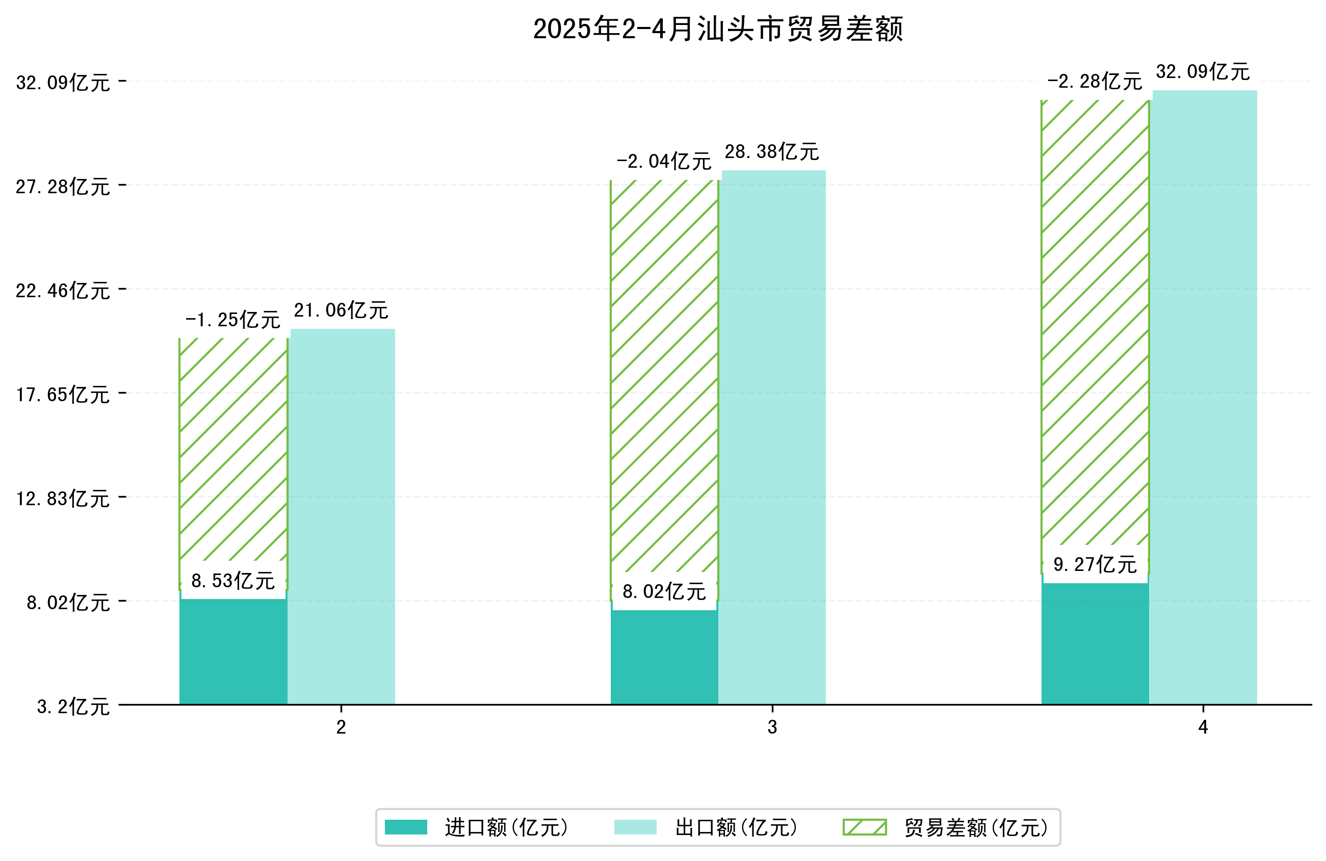 以人民币计,2025年1-4月汕头市贸易差额为85,0631,2487万元(贸易顺差),相比上年同期减少了13,4990,6471万元,同比减少-13.7%。