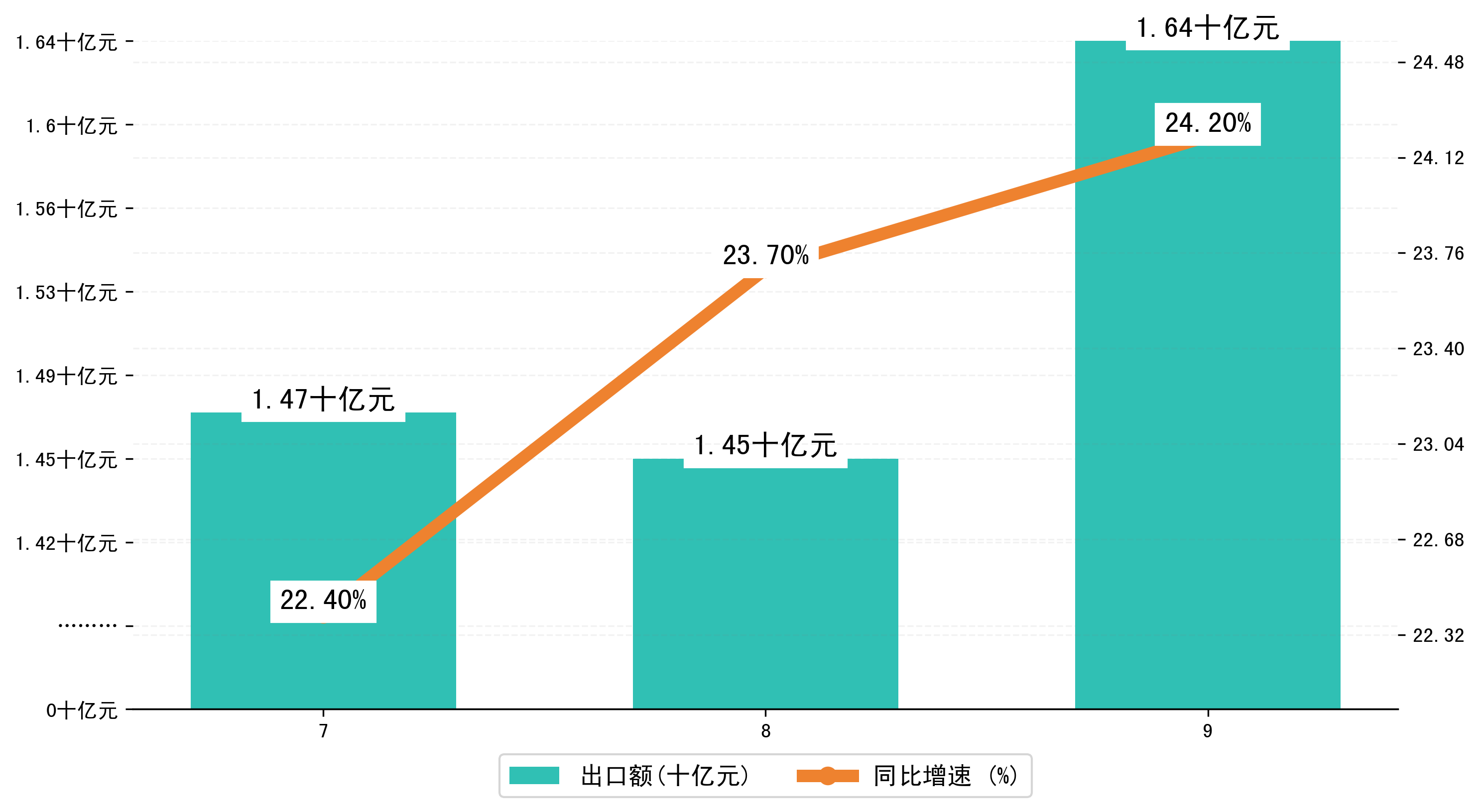 以人民币计,2025年1-9月丹东市出口额为128,9647.447万元,相比上年同期增加了25,1485.7486万元,同比增加了24.20%。