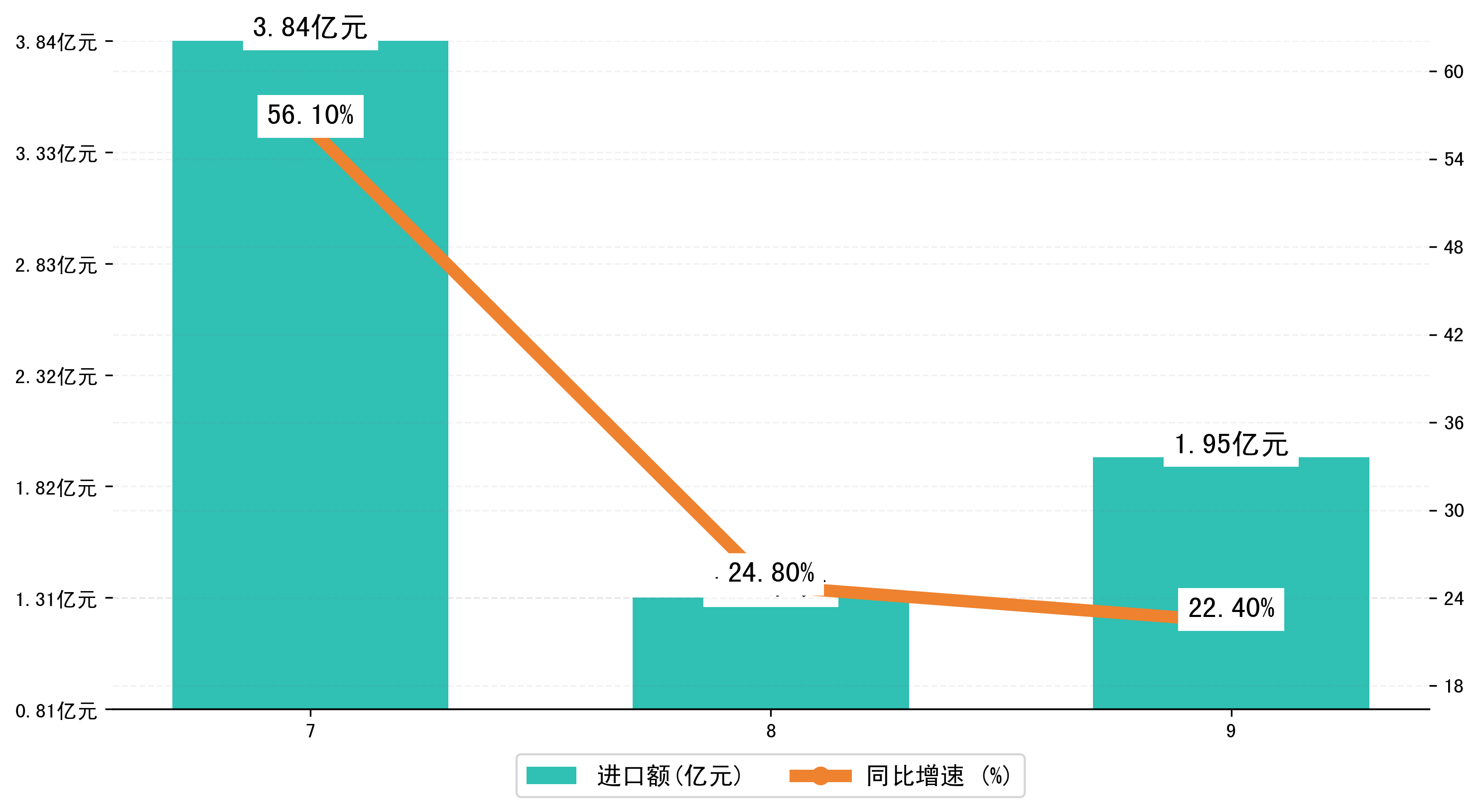 以美元计,2025年9月丹东市进口额为2736.8391万美元,相比上月增加了899.7607万美元;相比上年同期增加了42.3879万美元,同比增加21.40%。